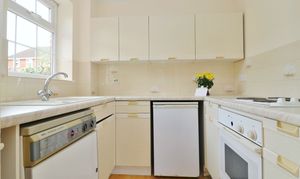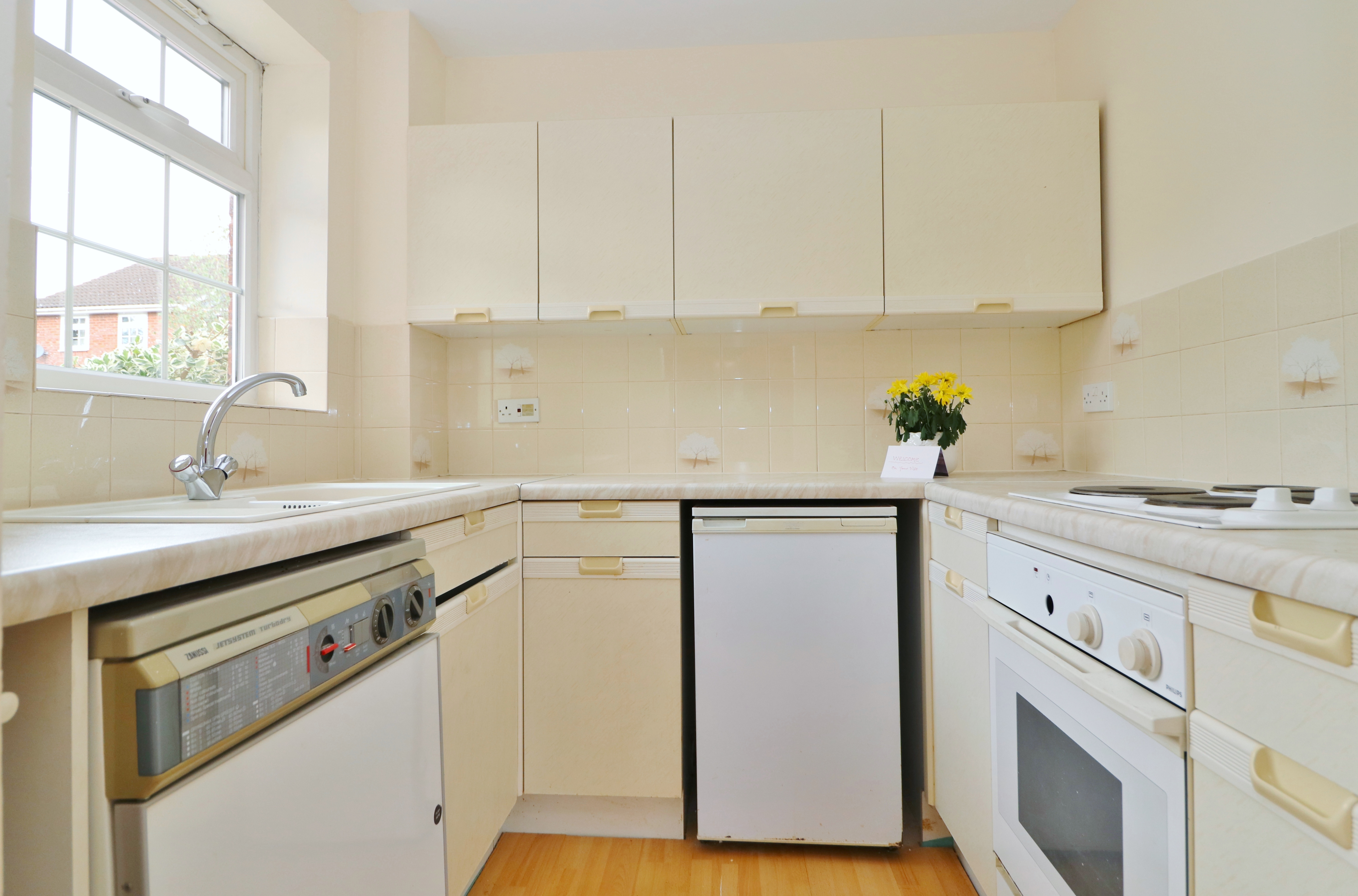 The kitchen has a window to the front aspect and has been fitted with a range of wall and base units with a built-in oven and hob, as well as free-standing appliances including an under counter fridge and washing machine.