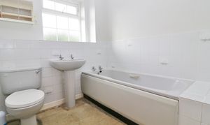 The bathroom has a window to the front and comprises a panel enclosed bath, wash hand basin and WC.