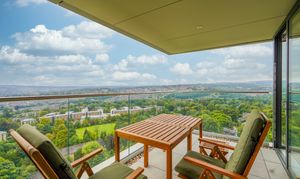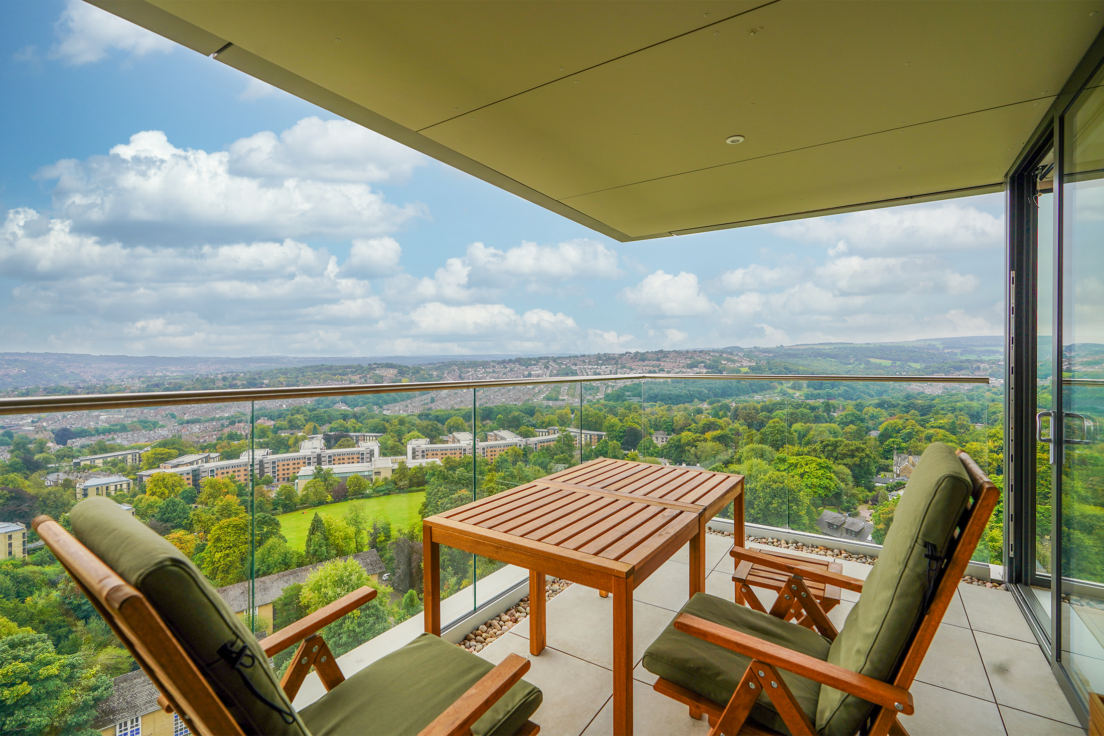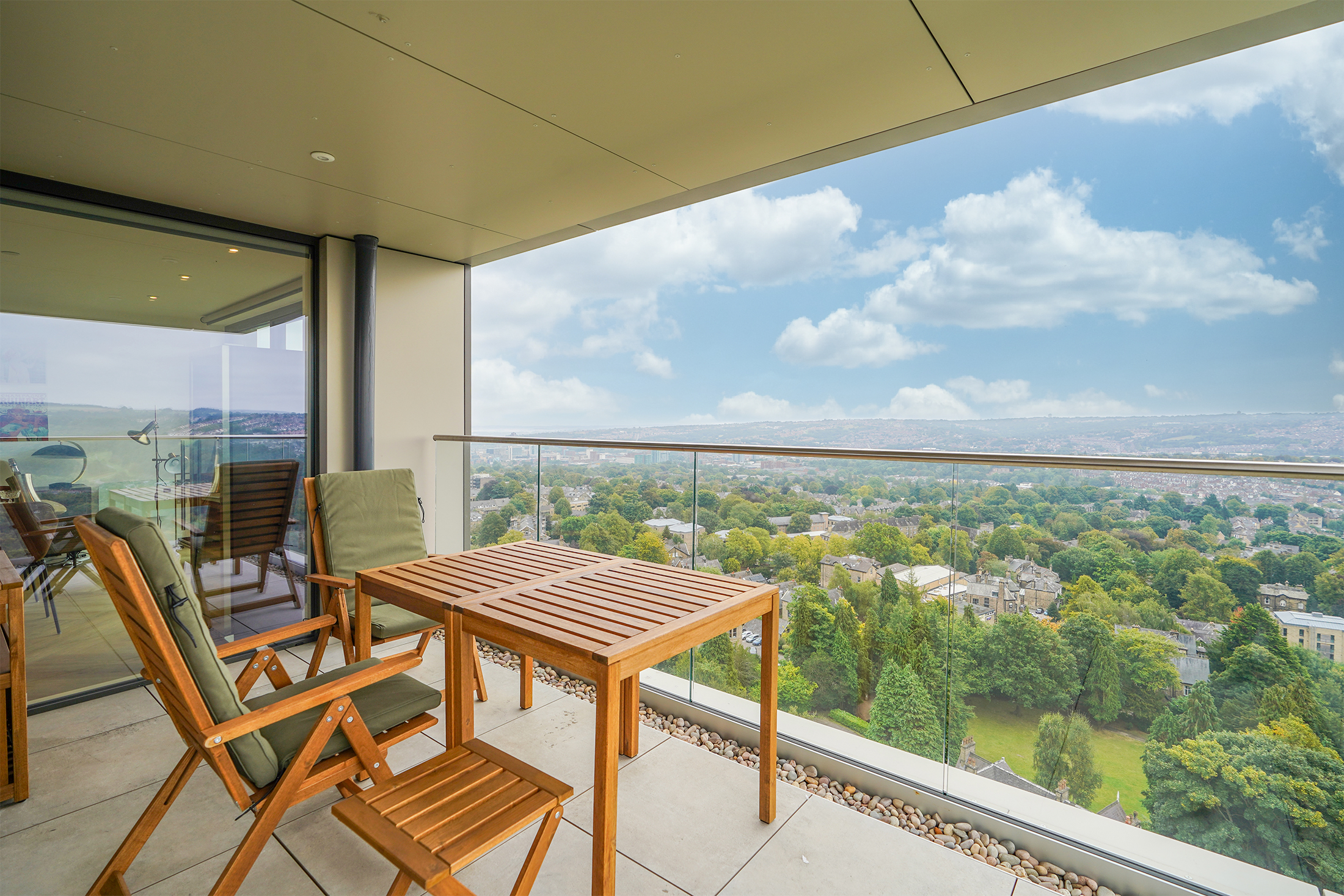Balcony with far-reaching views off the main living place, alongside communal gardens.