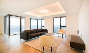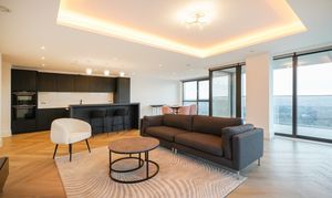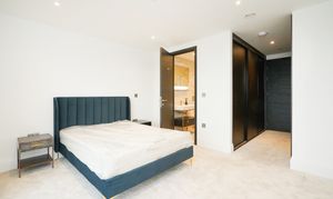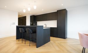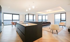 The open-plan living space benefits from floor-to-ceiling windows, allowing natural light to pour in. This space incorporates a SieMatic kitchen with quartz worktops, integrated Siemens appliances, and a feature island unit, making it an ideal space for entertaining. The principal bedroom includes a dressing area with built-in wardrobes and a deluxe en-suite shower room. The second bedroom is also equipped with fitted wardrobes and is served by a deluxe fully tiled main bathroom with a modern large shower cubicle, bath, and vanity unit. You also have additional storage along the hallway with three generous fitted storage cupboards.
