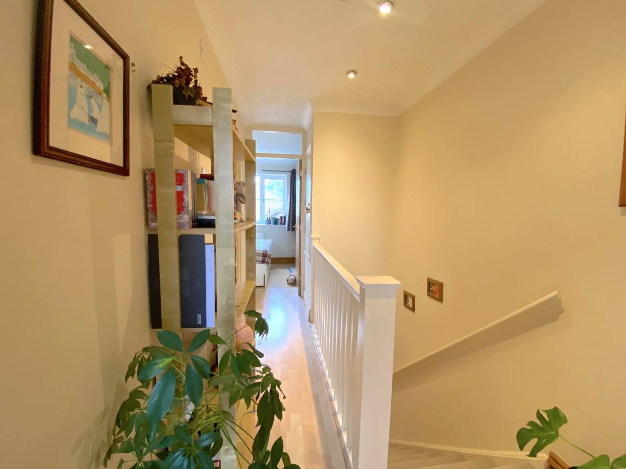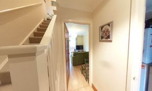 Entrance hall with wood effect flooring and stairs rising to 1st floor.