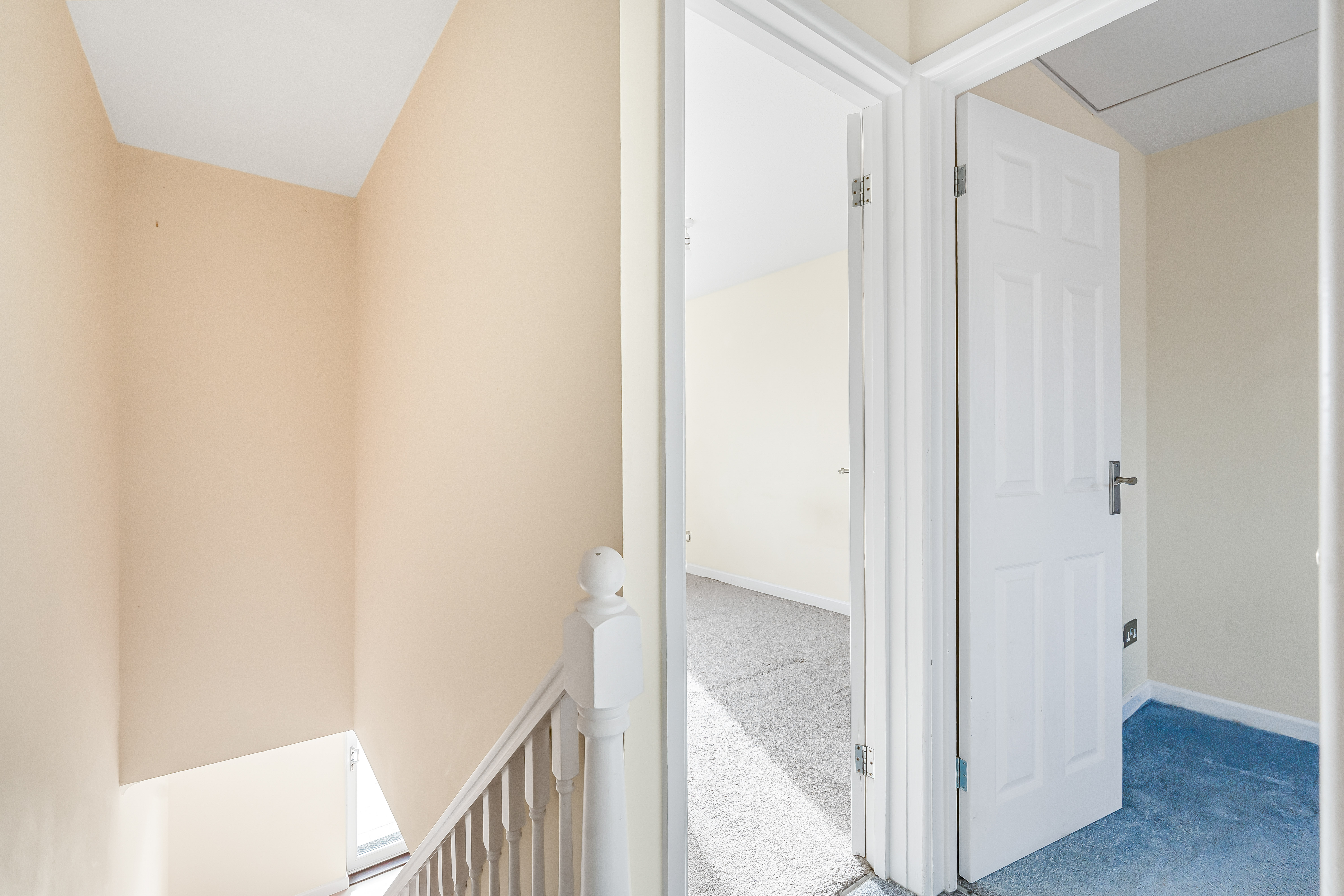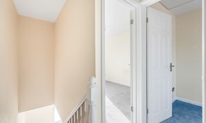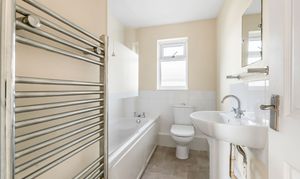 The first floor two bedrooms and a bathroom with white suite and heated towel rail.