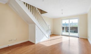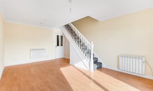 To the rear a generously sized lounge which is flooded with natural light thanks to the patio door that looks out over the low maintenance paved garden, it has laminate flooring with stairs leading to the first floor.