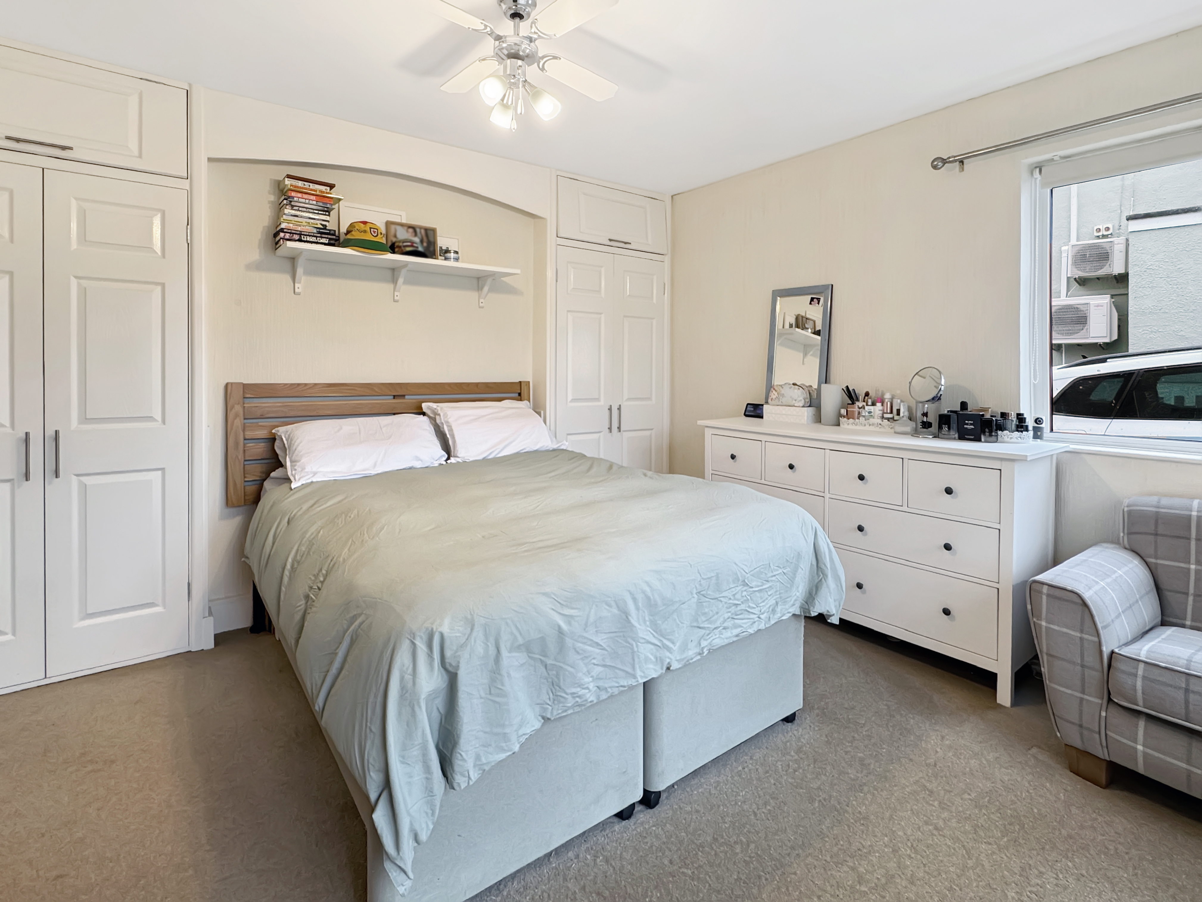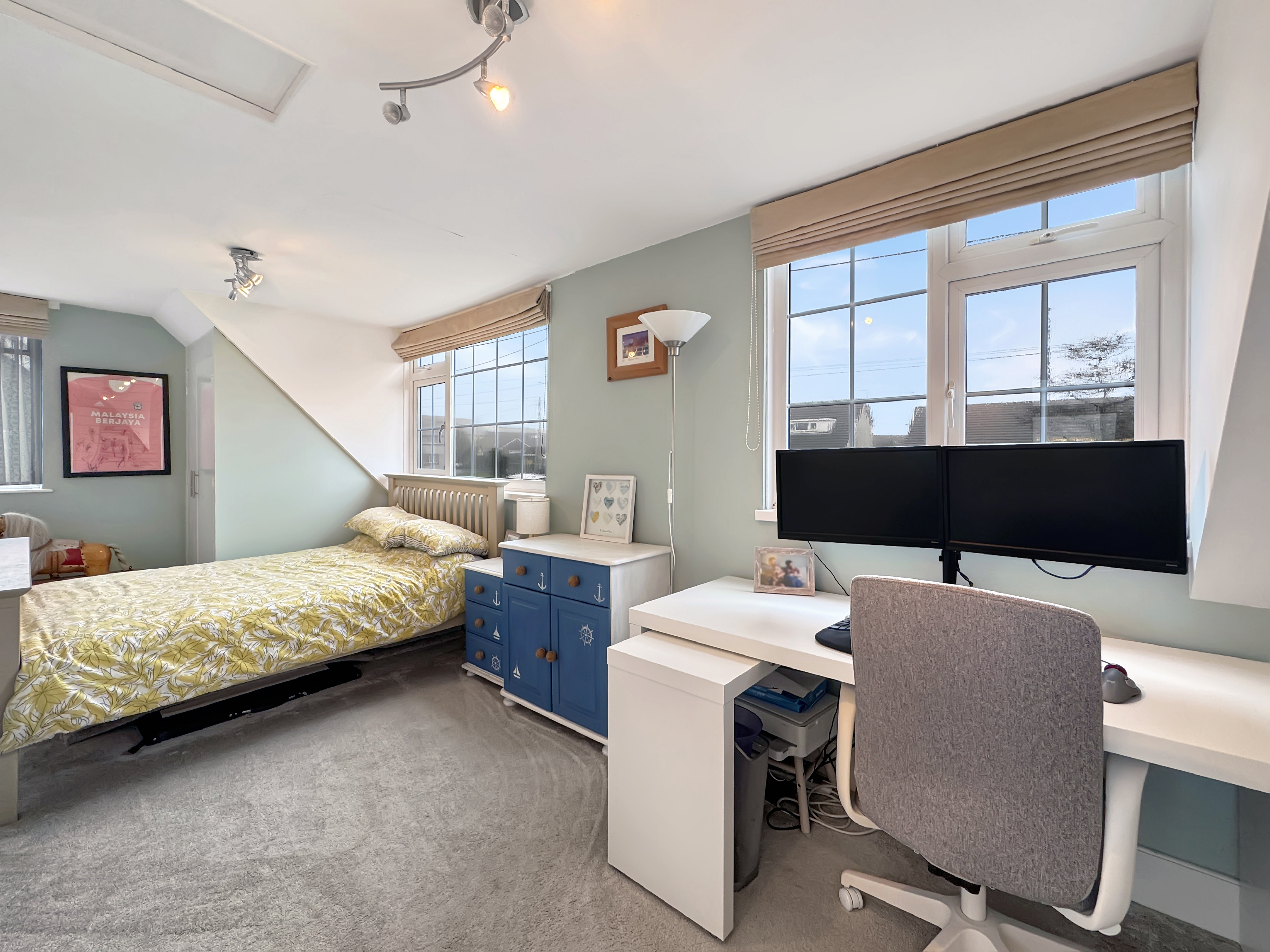 To the first floor are two further generous bedrooms, including a spacious bedroom with extensive built-in storage, alongside a family bathroom. The property was originally constructed as a four-bedroom home and offers clear potential to reinstate the fourth bedroom should a purchaser require additional accommodation.