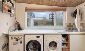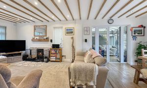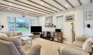 The heart of the home is the spacious living room, a warm and inviting space featuring exposed ceiling beams, recessed lighting and a wood-burning stove, creating a real focal point and a cosy atmosphere. This room flows naturally into the dining area and onward to the sun room, which provides a bright and relaxing space overlooking the garden and offers a seamless connection between indoor and outdoor living — particularly appealing given the property’s west-facing orientation, perfect for enjoying sunny afternoons and evening sunsets.