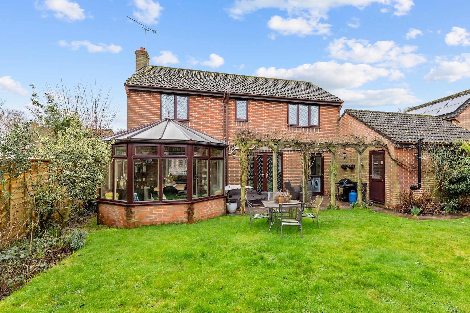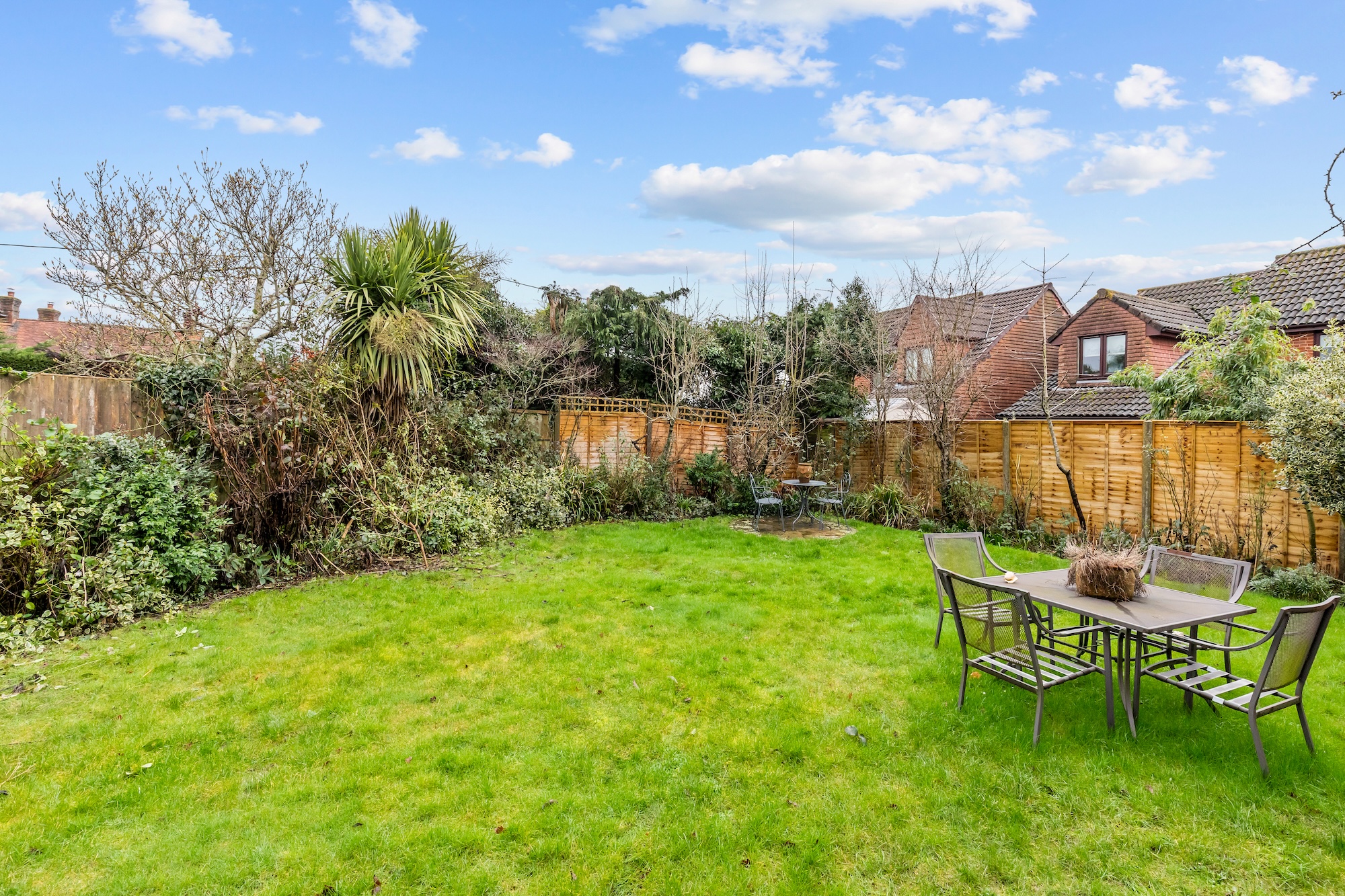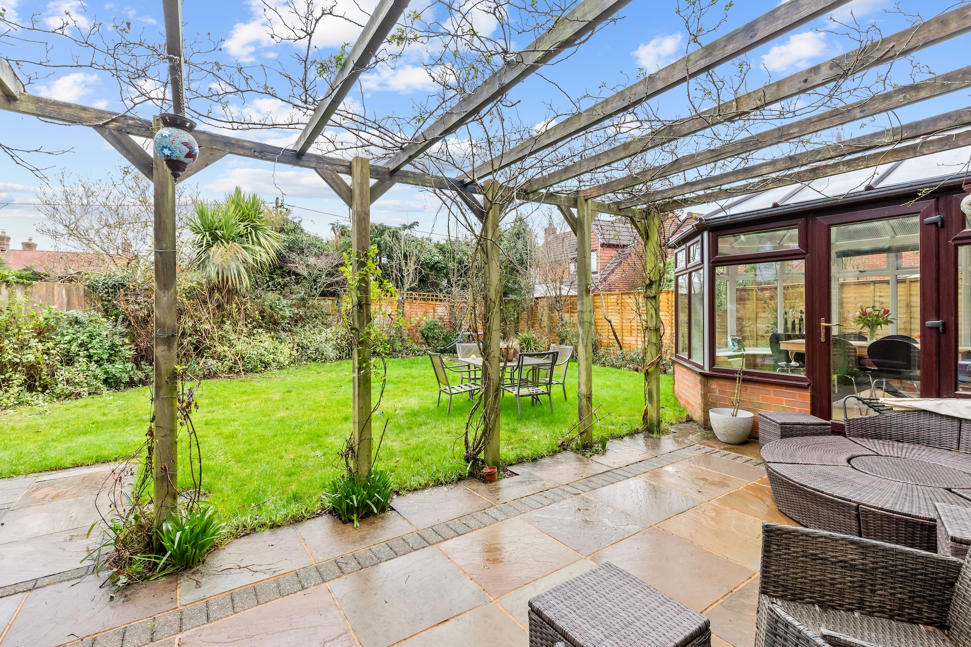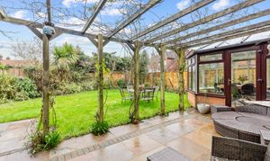 The 59’x 36’ rear garden is predominantly lawned with well stocked borders, paved patio with pergola and access into the garage and onto the driveway.