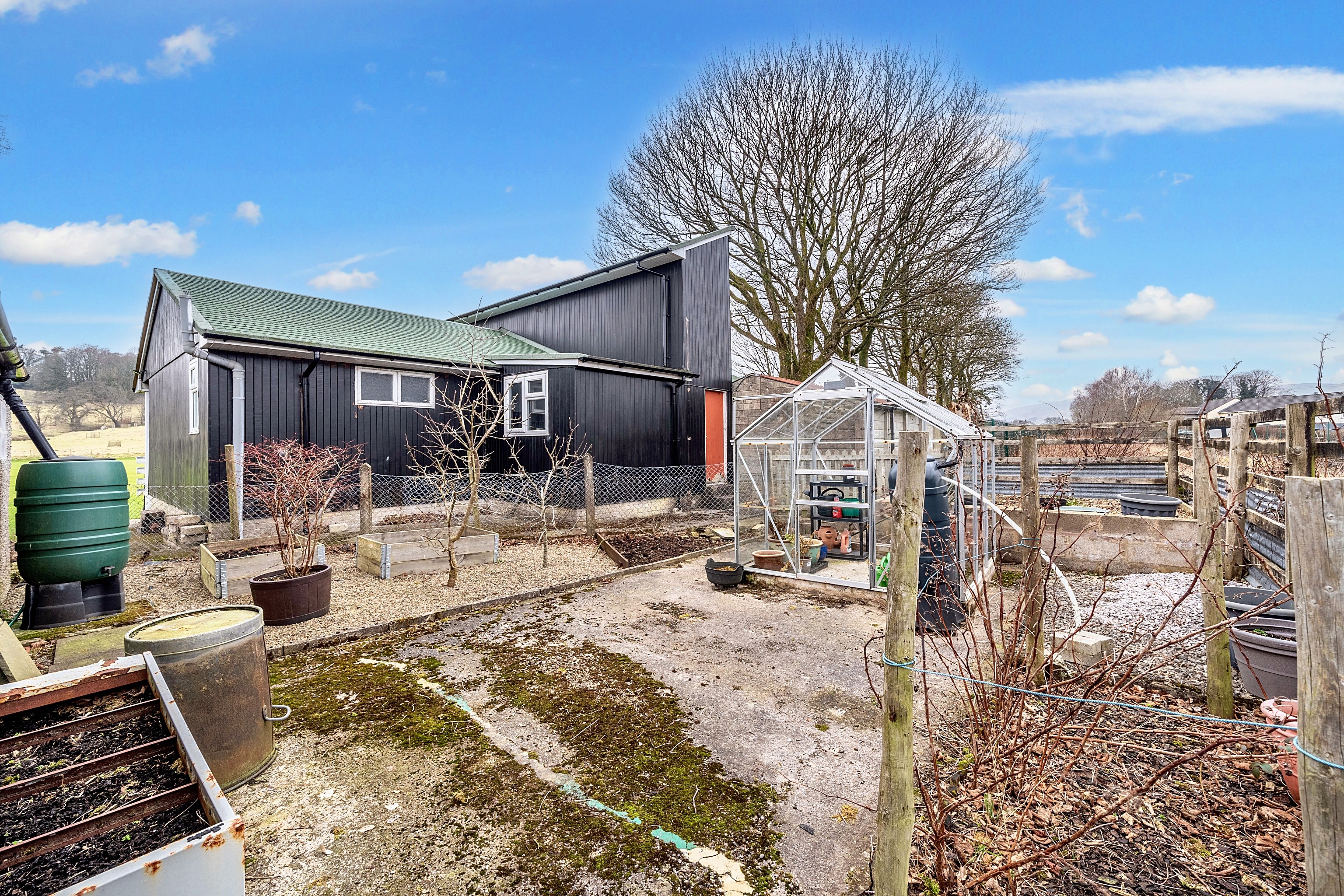 Extensive grounds to both the front and rear of the property with the rear garden having a fruit and veg area behind the double garage. The rear garden has a well kept lawn, gravelled driveway leading to the double garage and a paved patio seating area that connects to the rear of the property. To the side of the home there are planting beds and outbuildings for storage. At the very front is a gravelled driveway which has plenty of space for family and visitors and a well kept lawn.
