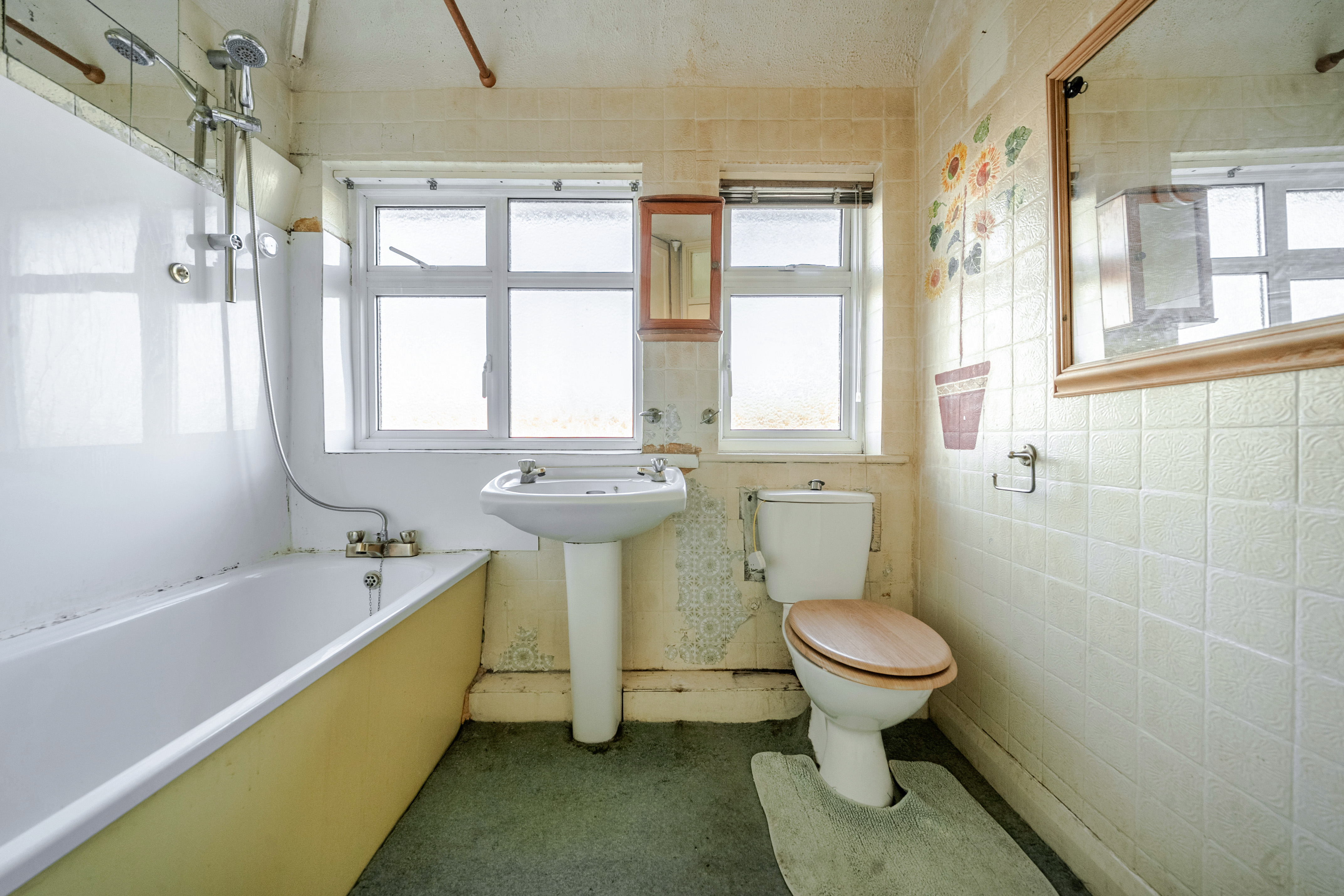 Two double glaze frosted windows, WC, pedestal wash hand basin, panel enclosed bath with shower mixer, airing cupboard housing Ideal Logic condensing combi boiler.