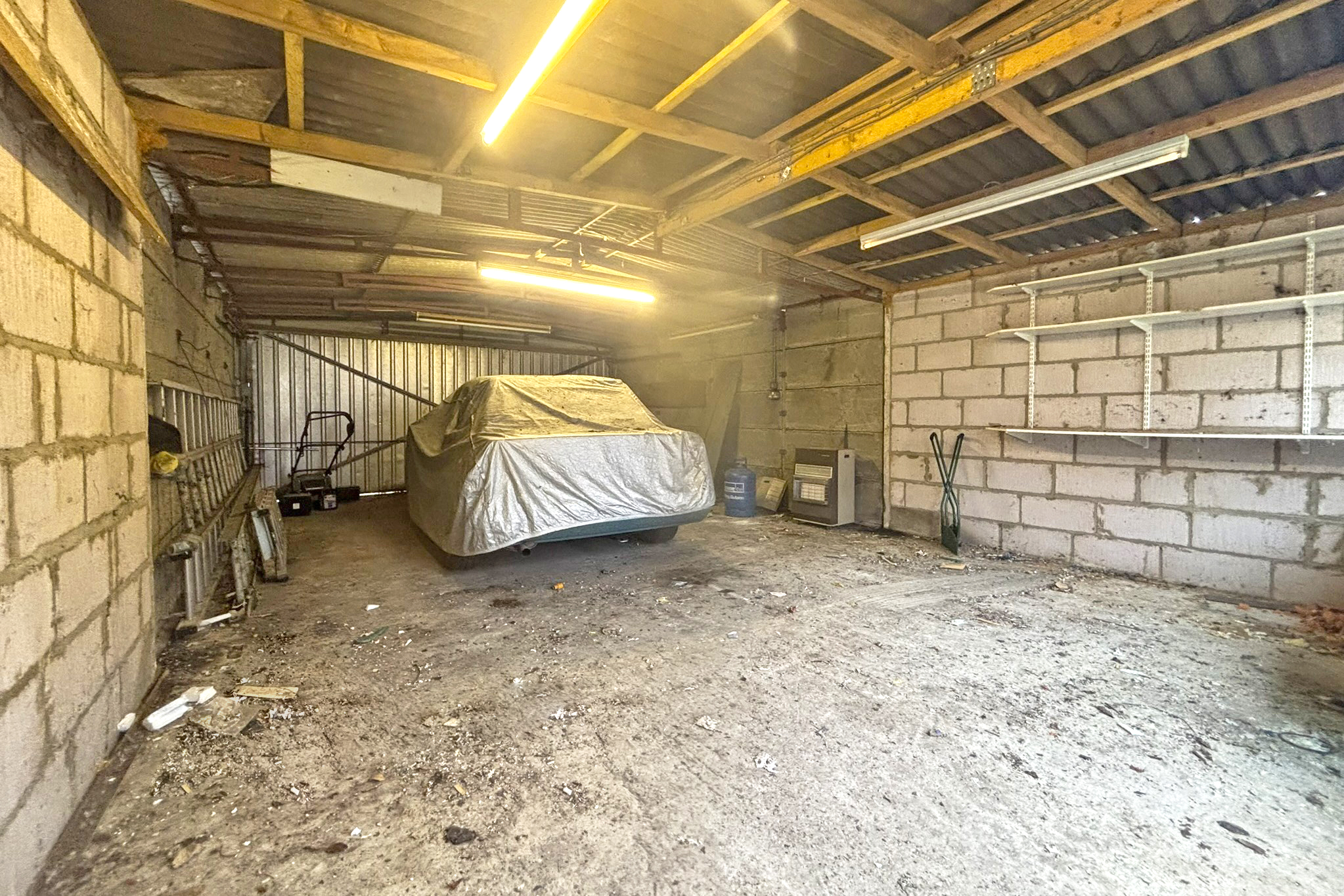 Large rear garage 27 ft 7 (8.4m) x 16 ft 2 (4.92m) with up an over door and personal double glazed door to the garden. Double glazed window, 5 striplights, power sockets.