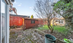 Paved patio to immediate rear of the house with outside tap and garden shed 9 ft 5 (2.88m) x 4 ft 11 (1.5m). Main area grassed with borders and trees, rear access gate.