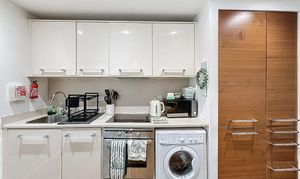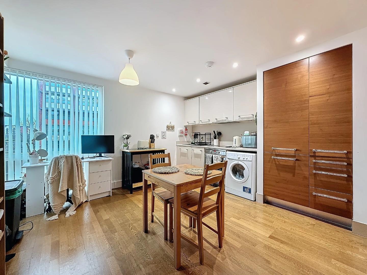Modern Apartment With Open-Plan Living - The apartment is designed with a modern open-plan layout, creating a light and airy feel throughout. The living area features a corner window, allowing plenty of natural light, making it an inviting space to relax or entertain. The kitchen area is fitted with an electric oven, hob, fridge/freezer, sink, and a kickboard heater, providing both practicality and comfort.