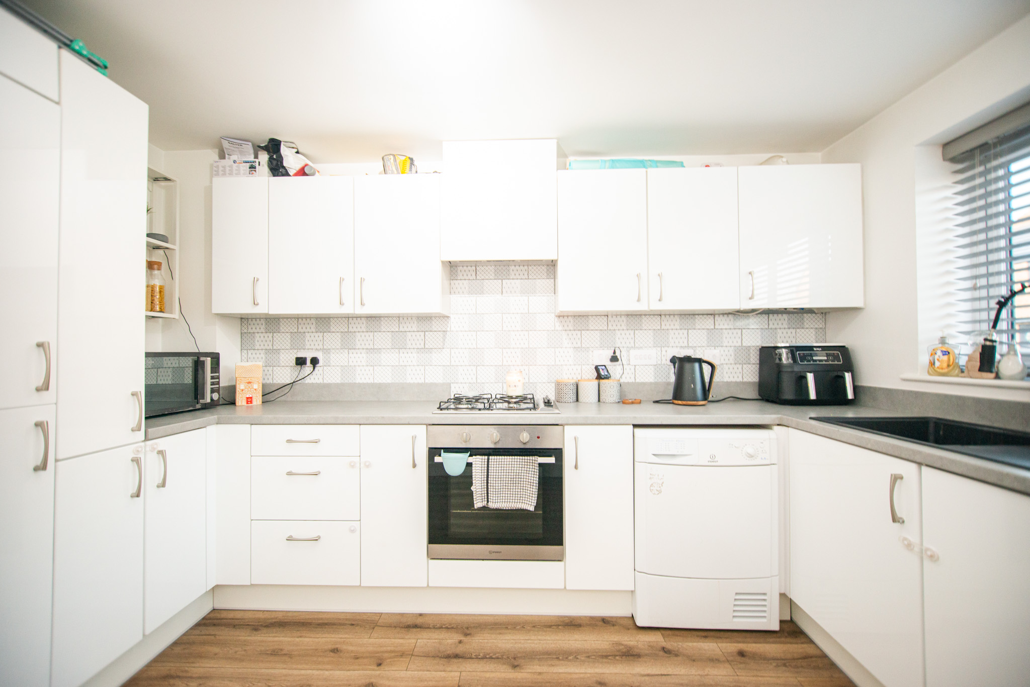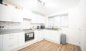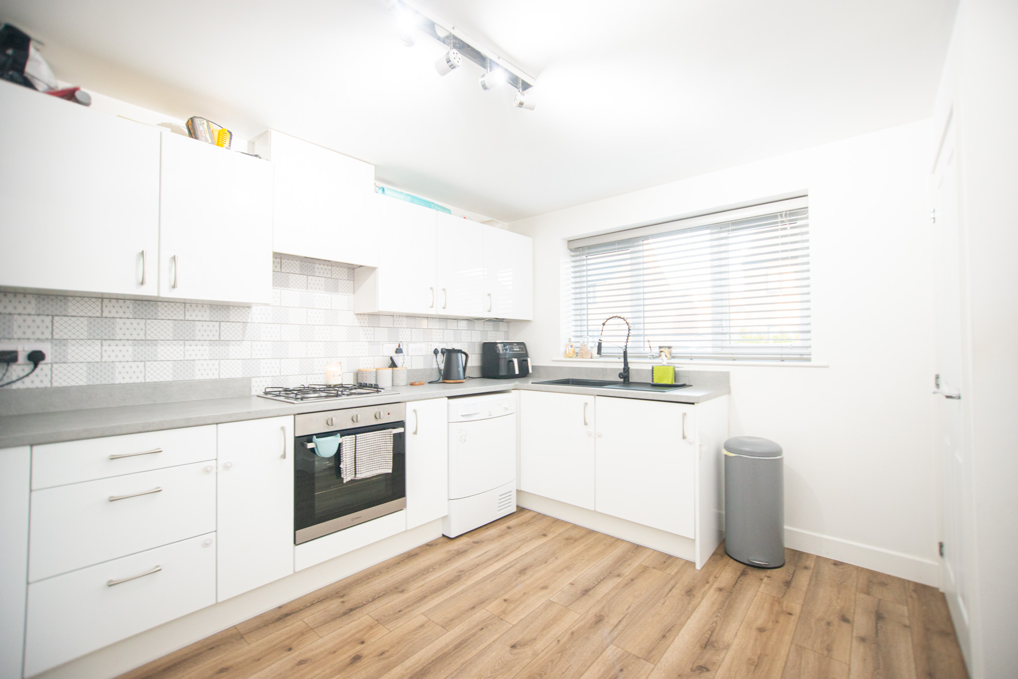 With laminate flooring, slab style units with handles, laminate worktops, integrated appliances of oven, hob, fridge freezer, extractor, sink and tap, and radiator.