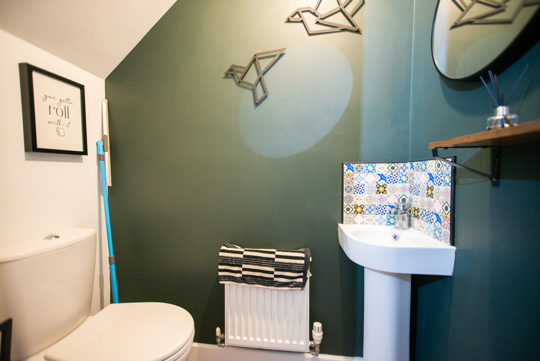 With laminate flooring, toilet, wash basin on pedestal with tile splash back, and radiator.