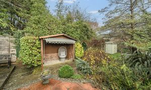 A key highlight is the impressive rear garden, extending well over 100ft and complete with two sheds, providing excellent outdoor space. The property features gas central heating and double-glazed windows, with attractive shutters to the front.
