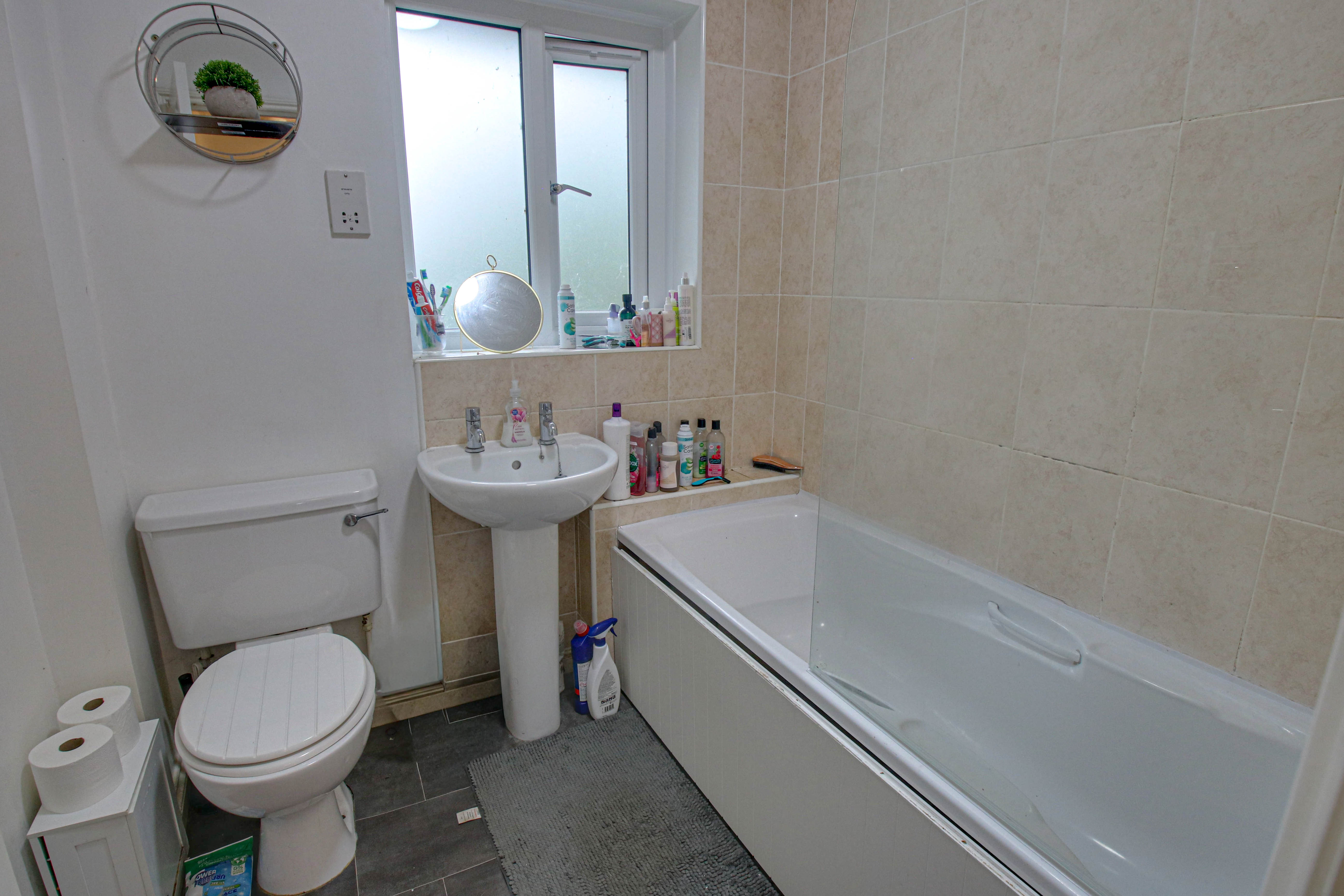 Front facing upvc double glazed window, three piece suite comprising of low flush wc, panel bath with shower, pedestal wash basin, splash back tiling and radiator.
