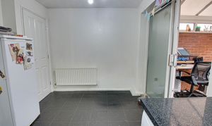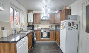 Rear facing upvc double glazed window, fitted range of base and wall units, electric oven and four ring gas hob, recently installed boiler, bowl and half sink drainer unit, splash back tiling, tiled floor, under stairs cupboard and radiator.