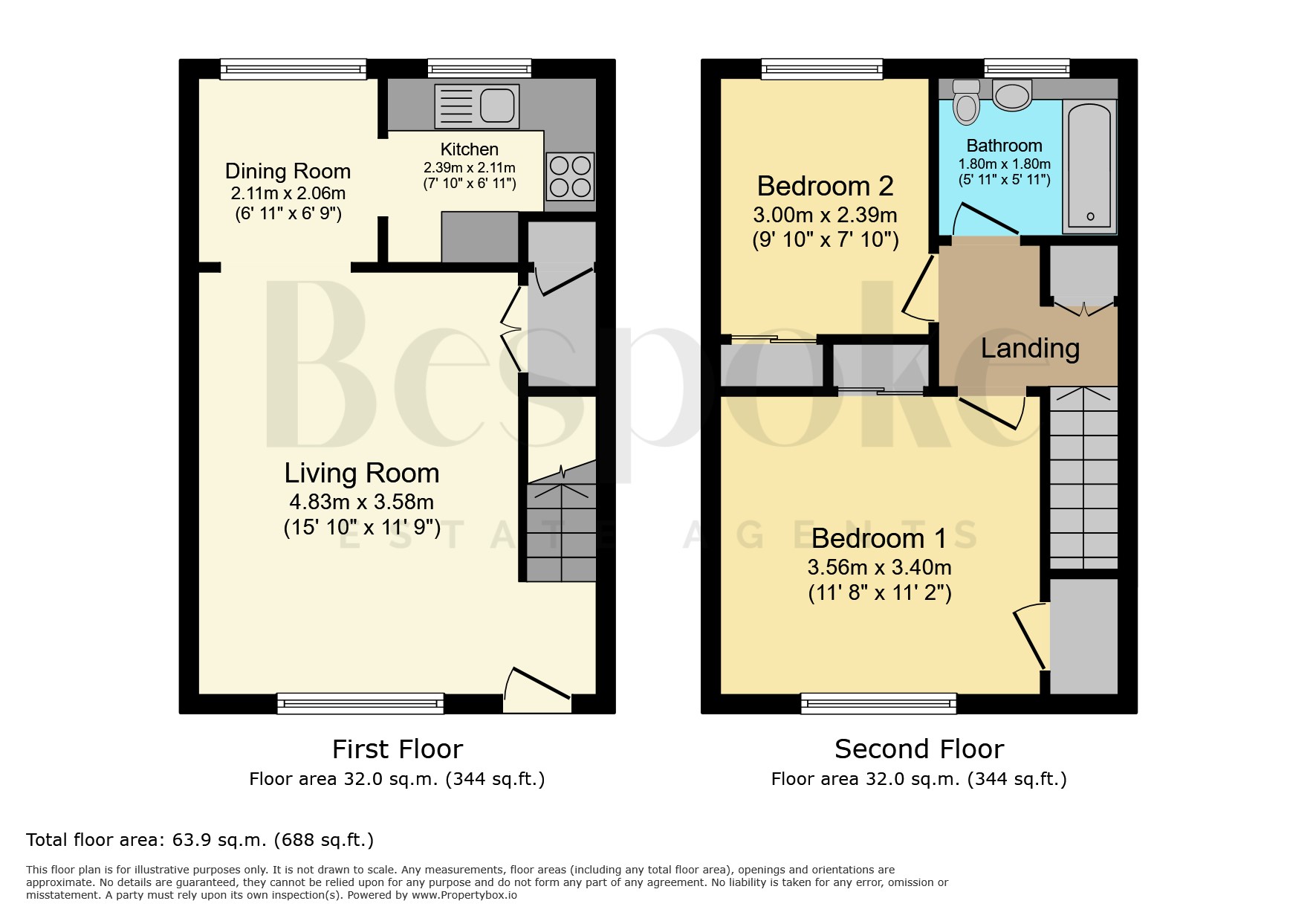 - Well balanced two bedroom layout arranged over two floors with clear separation of living and sleeping space.