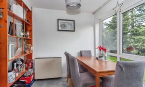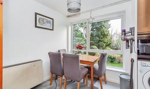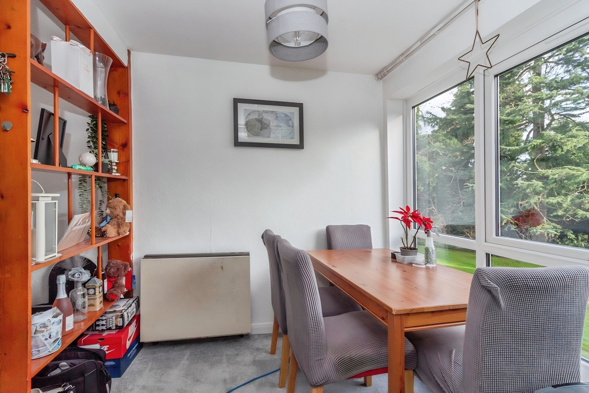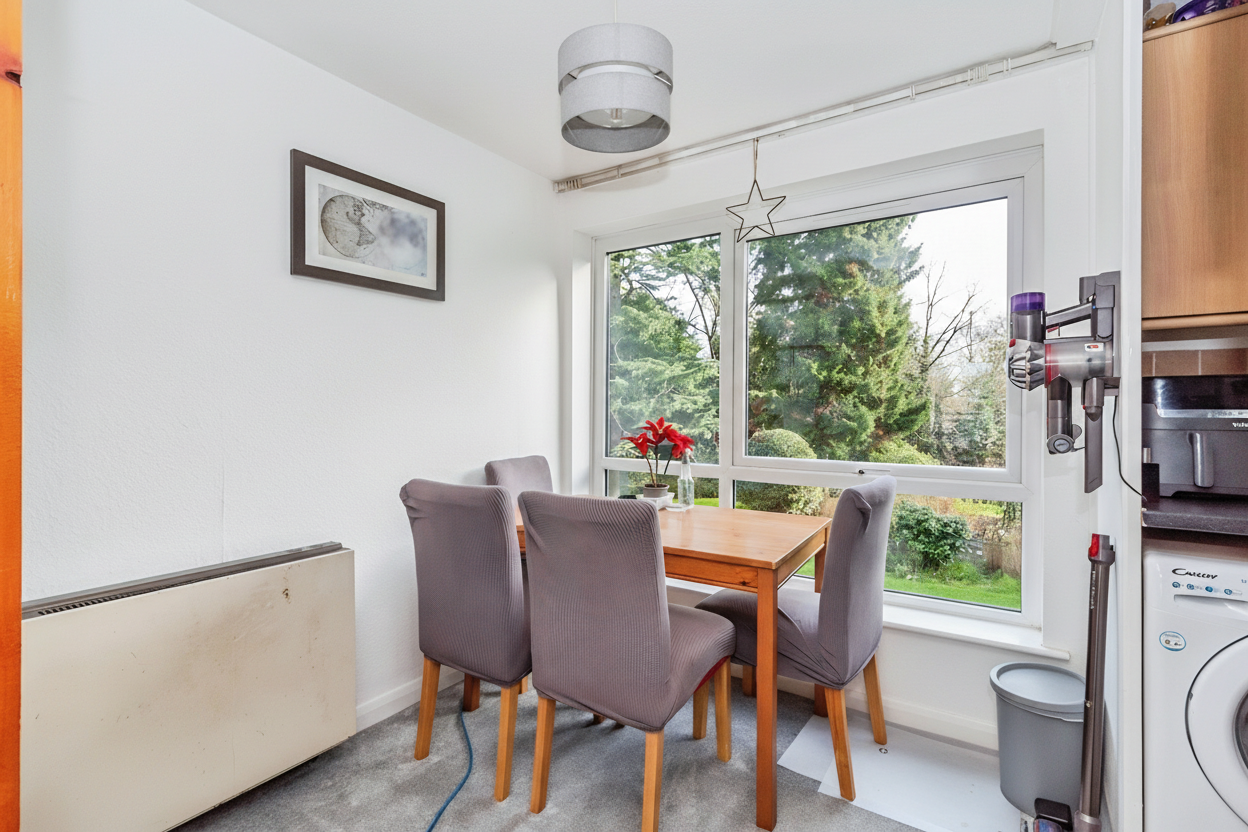 Positioned between the living room and kitchen, this separate dining area comfortably accommodates a table and chairs, ideal for everyday meals or entertaining. It keeps the layout sociable while still offering clearly defined spaces rather than a single open plan arrangement. Perfect views over the communal gardens.