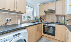 The kitchen is fitted with modern units with integrated oven and washing machine and ample space for appliances. Well arranged work surfaces and natural light from a large window create a practical and inviting space for daily use.