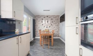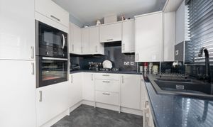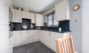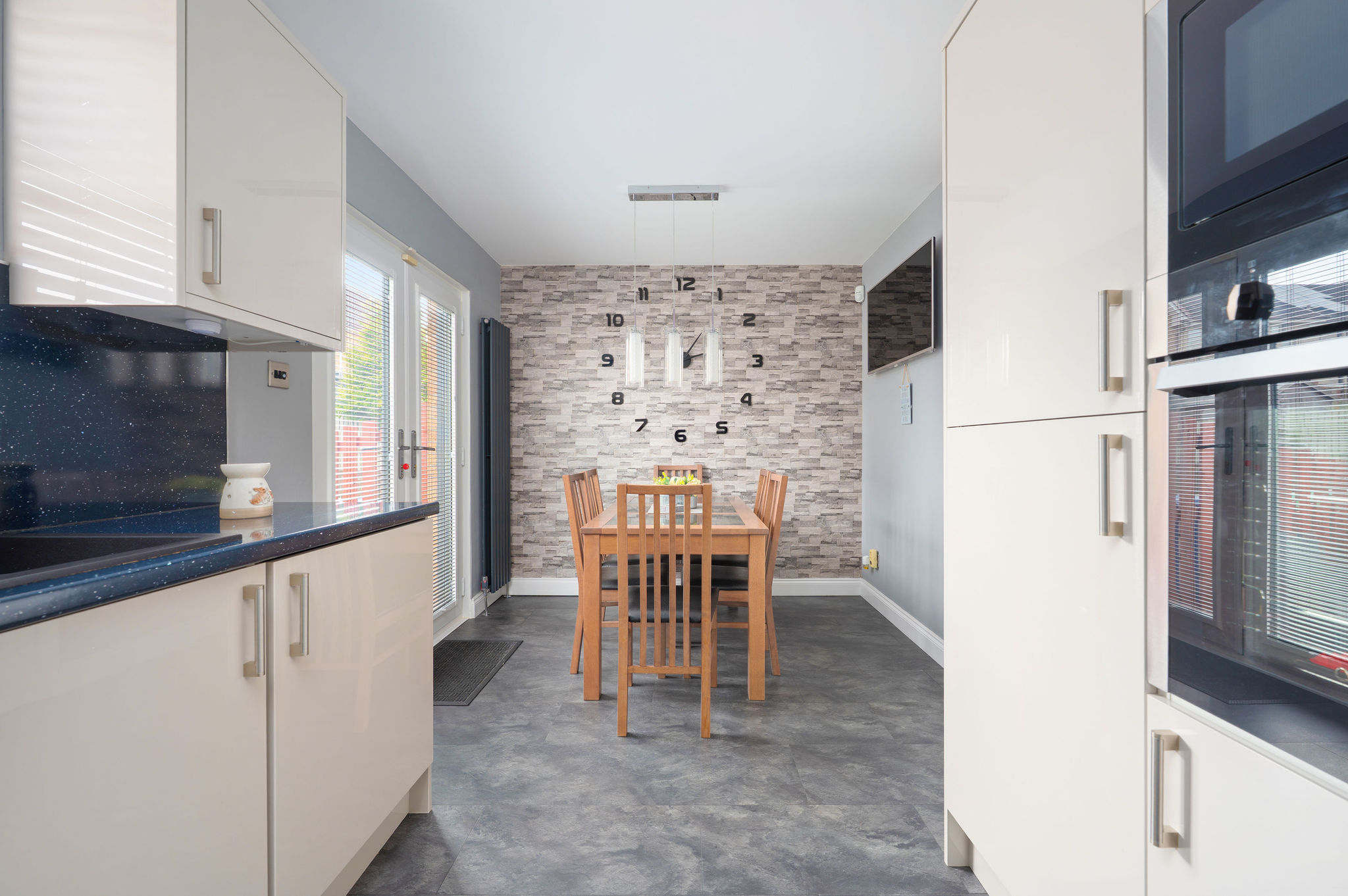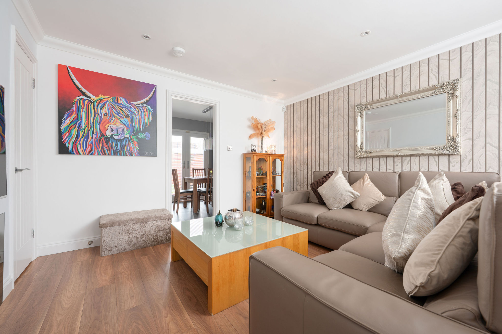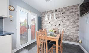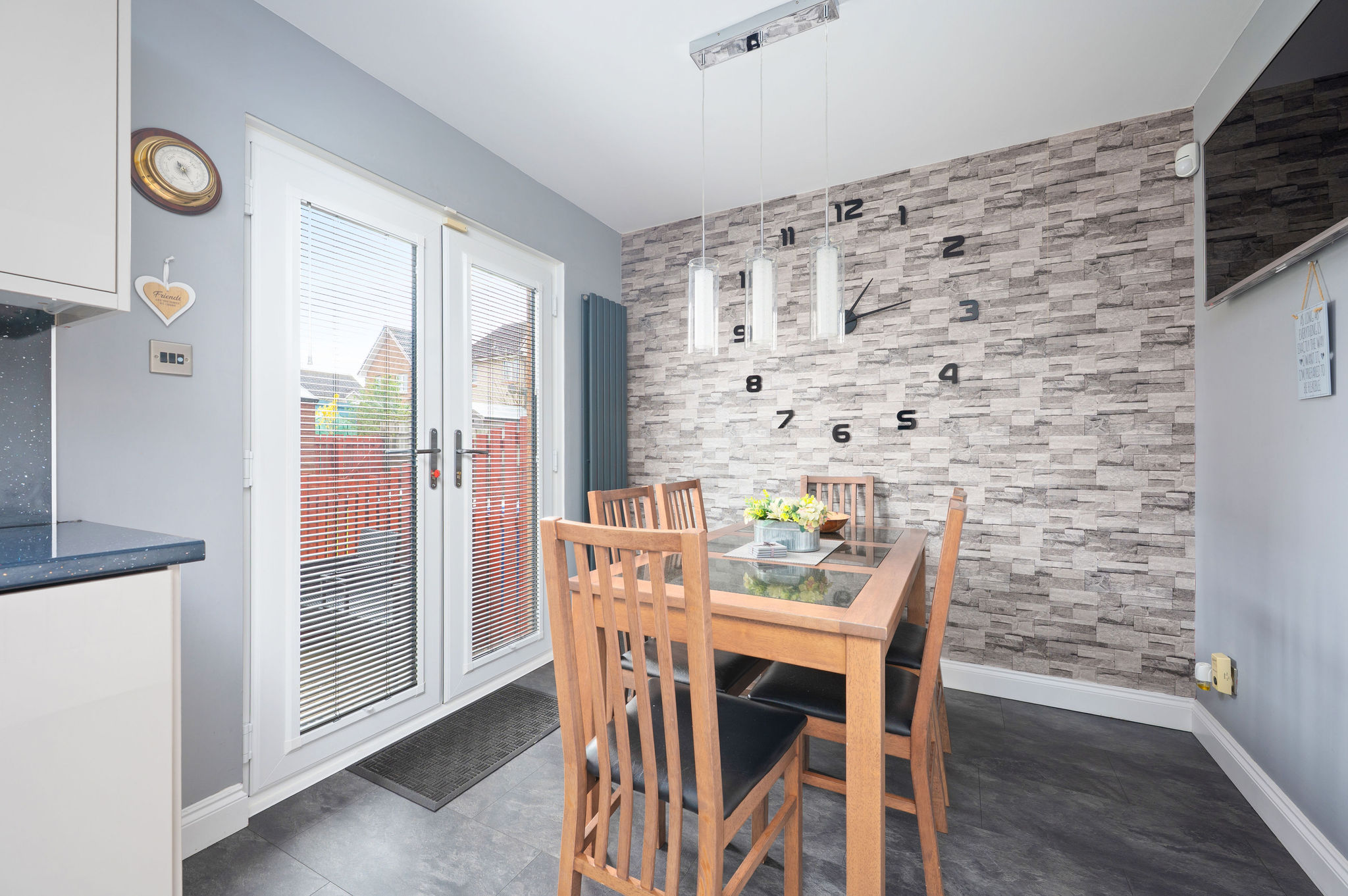 The ground floor features a bright and welcoming lounge, along with a stylish dining kitchen fitted with a built in gas hob, oven, microwave, fridge freezer, washing machine and dishwasher, ideal for modern living. French doors from the kitchen open directly onto the rear garden, creating a great space for both everyday life and entertaining.