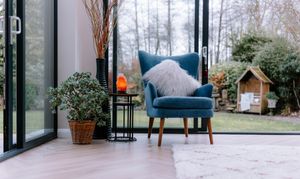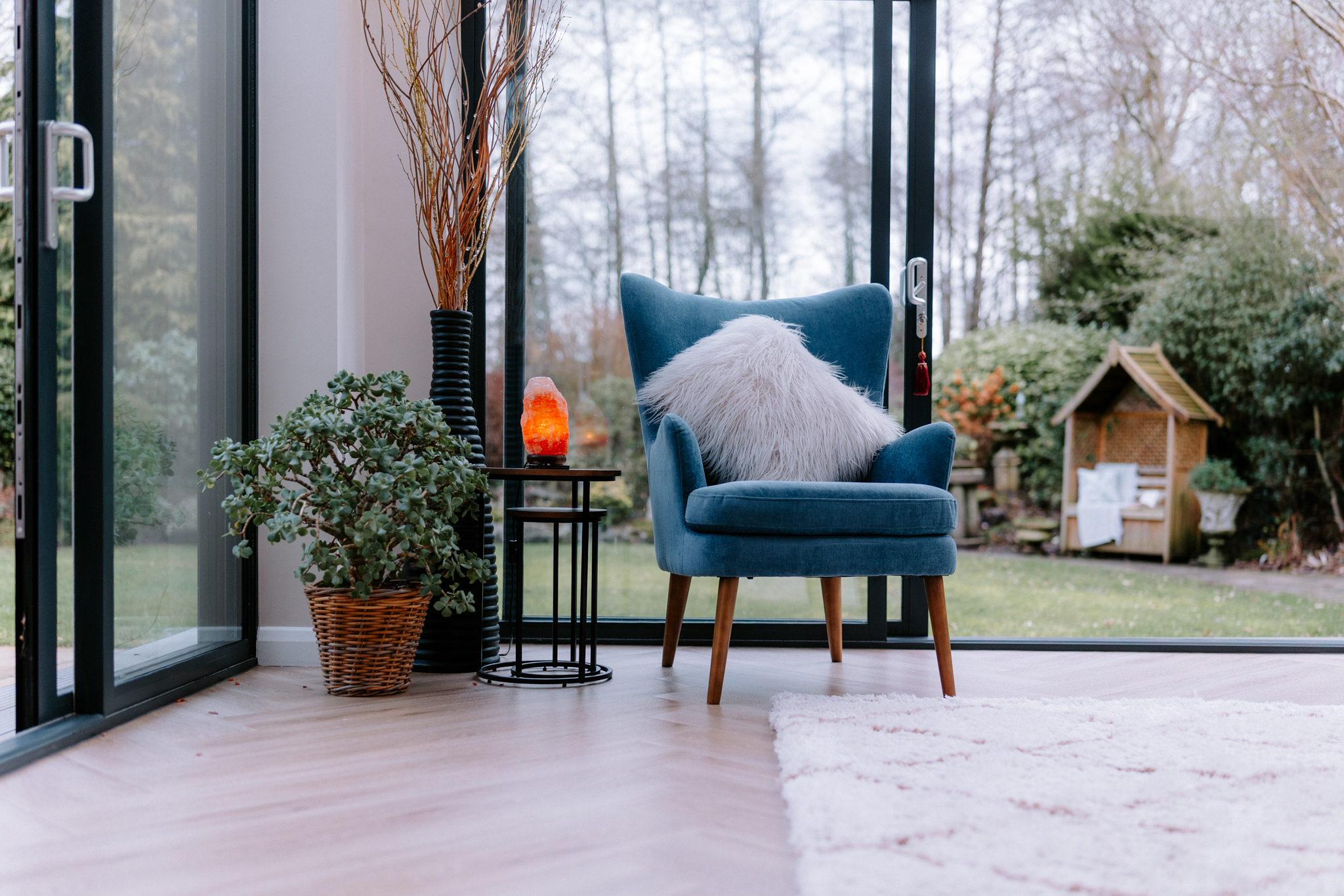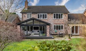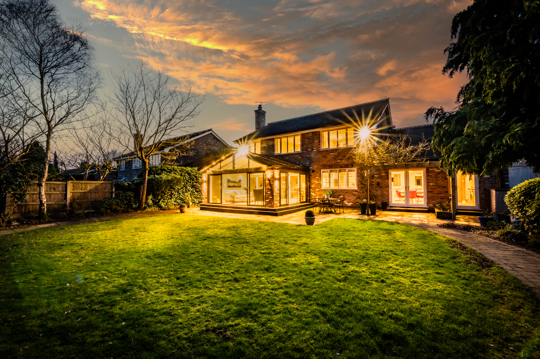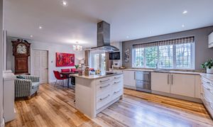 This impressive garden room is flooded with light from four large skylights set within the apex ceiling and wraparound sliding glazed doors on both sides, allowing the garden to flow effortlessly into the home. LVT wood-look flooring runs underfoot, and with additional side windows, light pours in from three aspects. Outdoor spotlights are fitted within the apex windows and the external lighting enhances the atmosphere in the evenings. It is a spectacular space for both relaxed family living and entertaining.