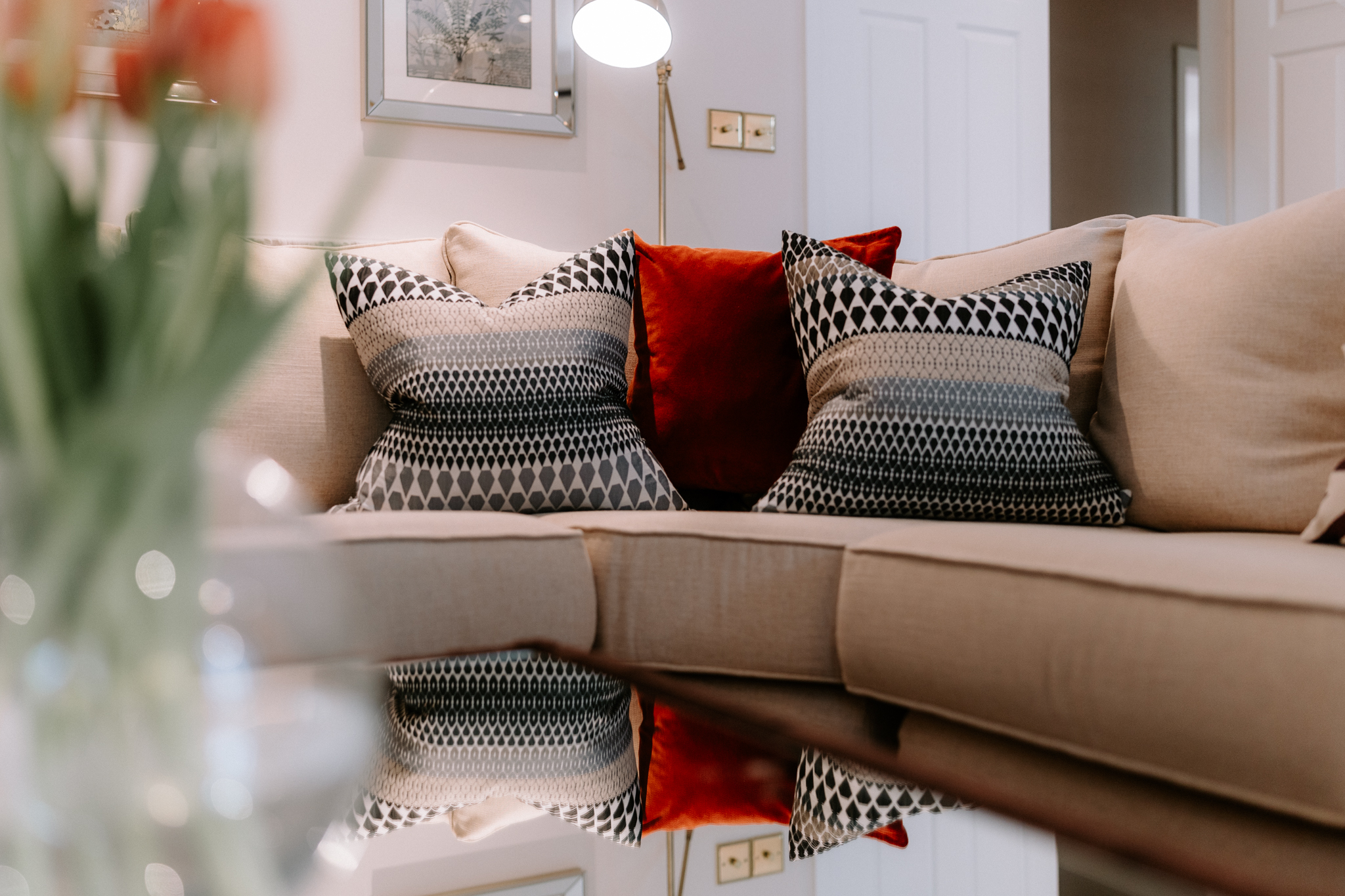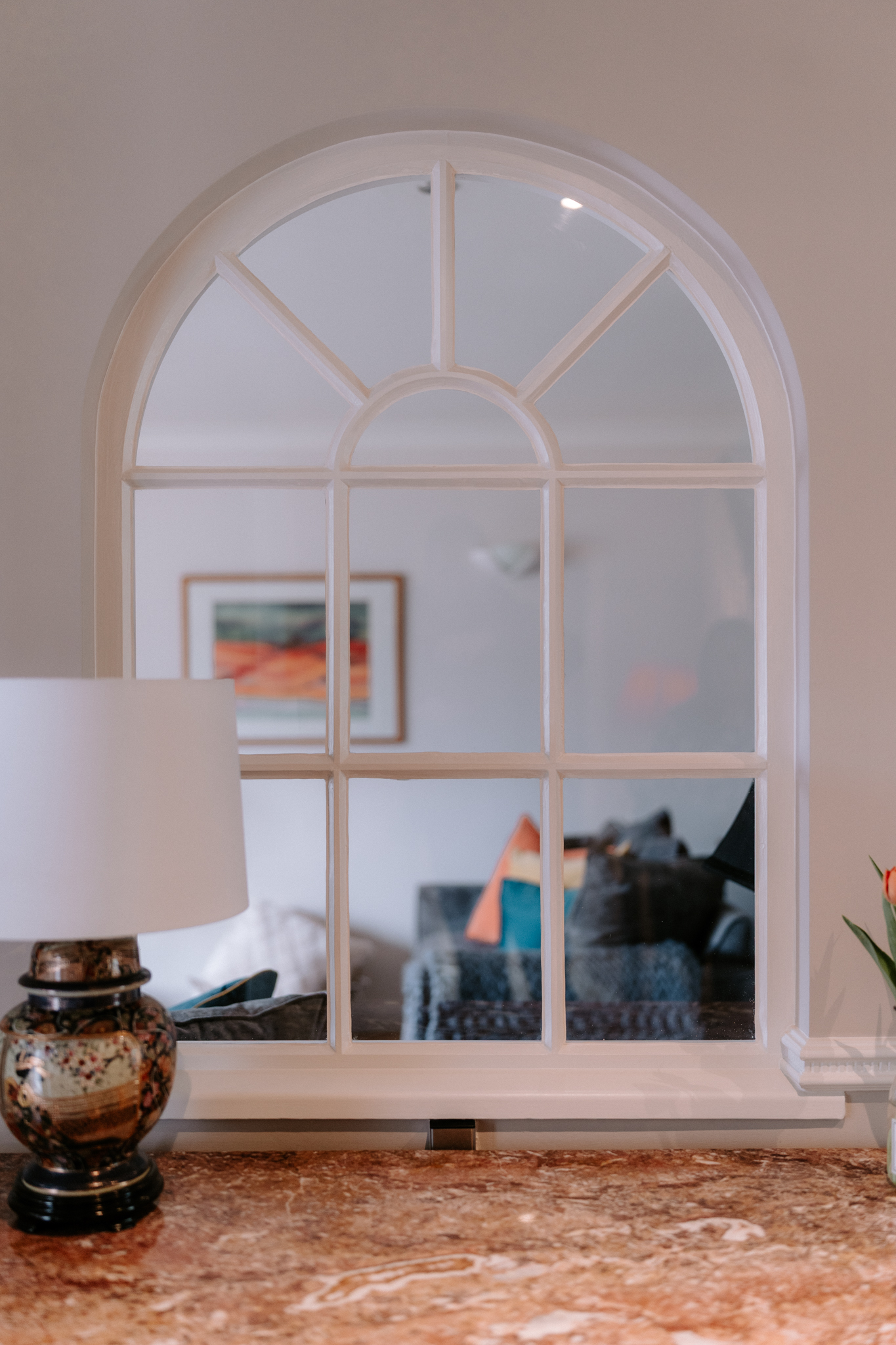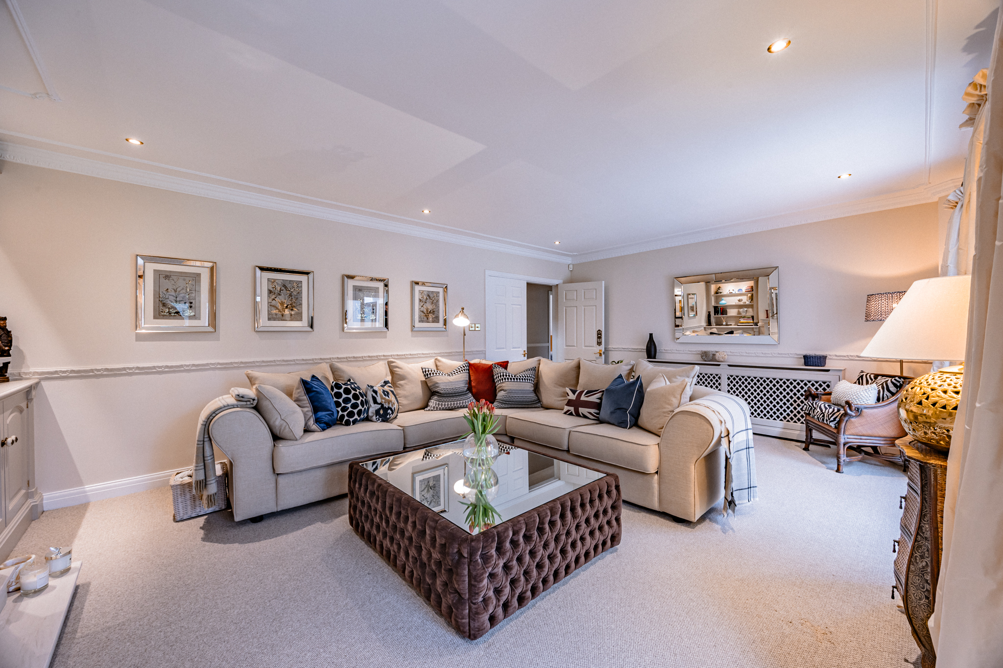 To the left of the hallway sits a cosy snug, positioned at the front of the house with a bay window overlooking the driveway and front door. Currently a comfortable retreat, it would equally make a charming playroom. Coir carpeting adds warmth underfoot, and an elegant arched internal window through to the hall provides a distinctive architectural feature.