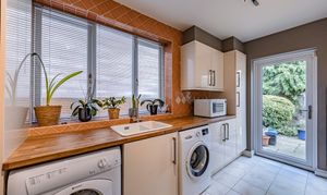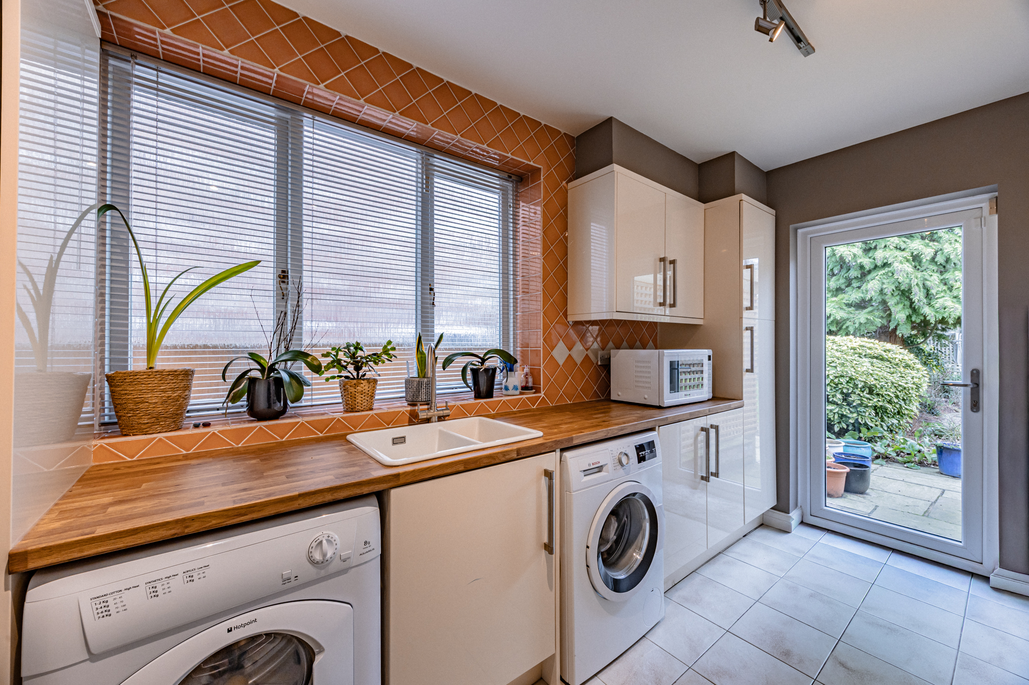 A well-appointed utility room sits just off the kitchen, featuring a full glass door to the garden, wood-look worktops, inset sink and a half beneath a side window, plentiful storage, space for appliances and a heated towel rail for drying clothes. From here, there is direct access to the integral double garage, which also benefits from an additional sink.