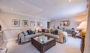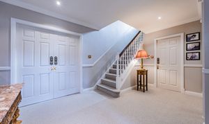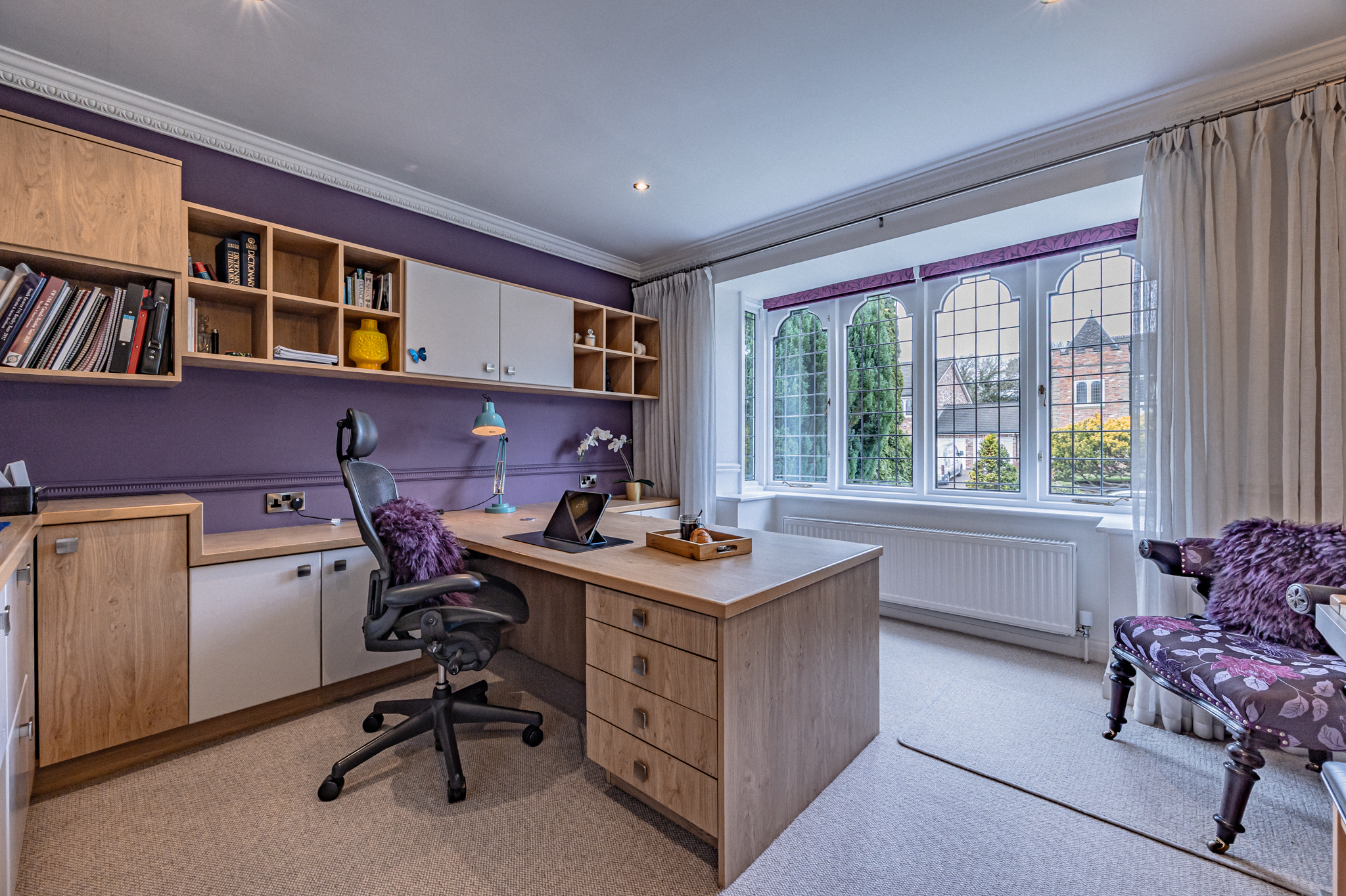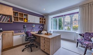 To the right of the large hallway, behind double doors, is a further reception room currently used as a home office. With a bay window to the front lawn and decorative coving, it offers a bright and peaceful workspace.