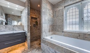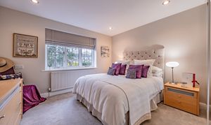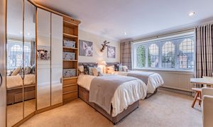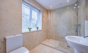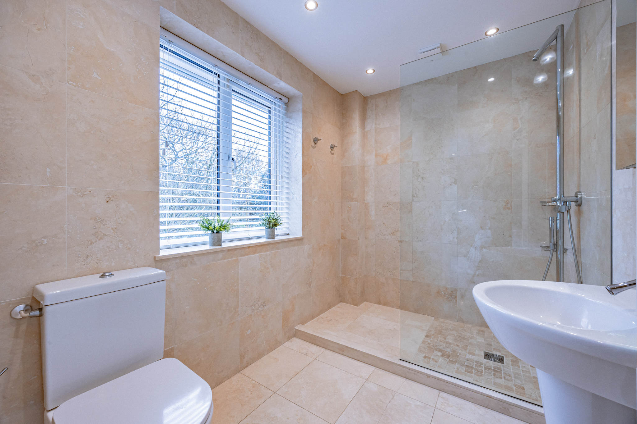 The remaining bedrooms are equally well-sized, several with built-in storage and one benefitting from an airing cupboard with shelving. The family bathroom delivers a luxurious hotel-like experience, tiled floor to ceiling with a wet room style shower, separate bath beneath the window, under-sink storage and electric underfloor heating.