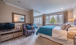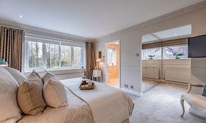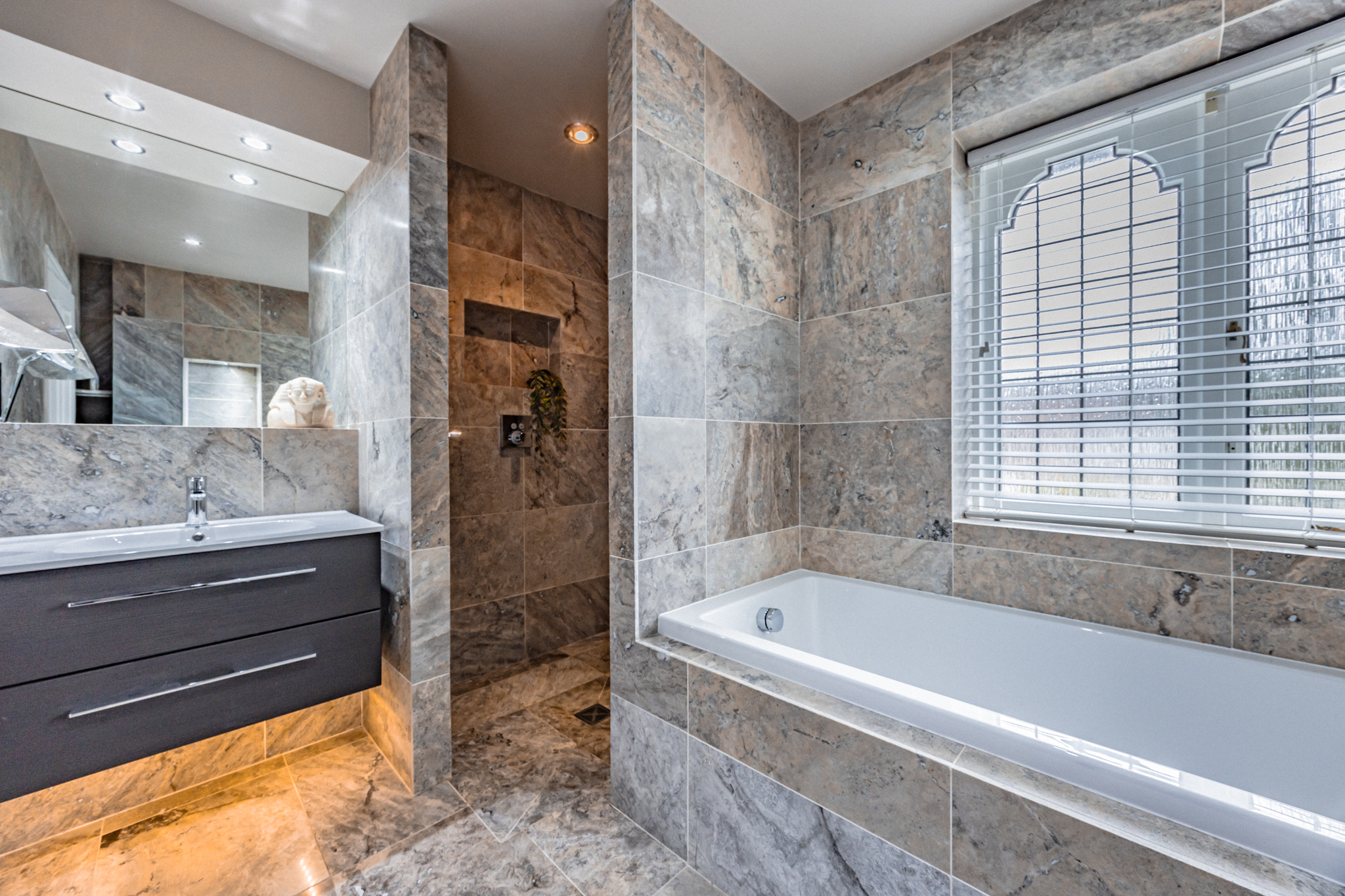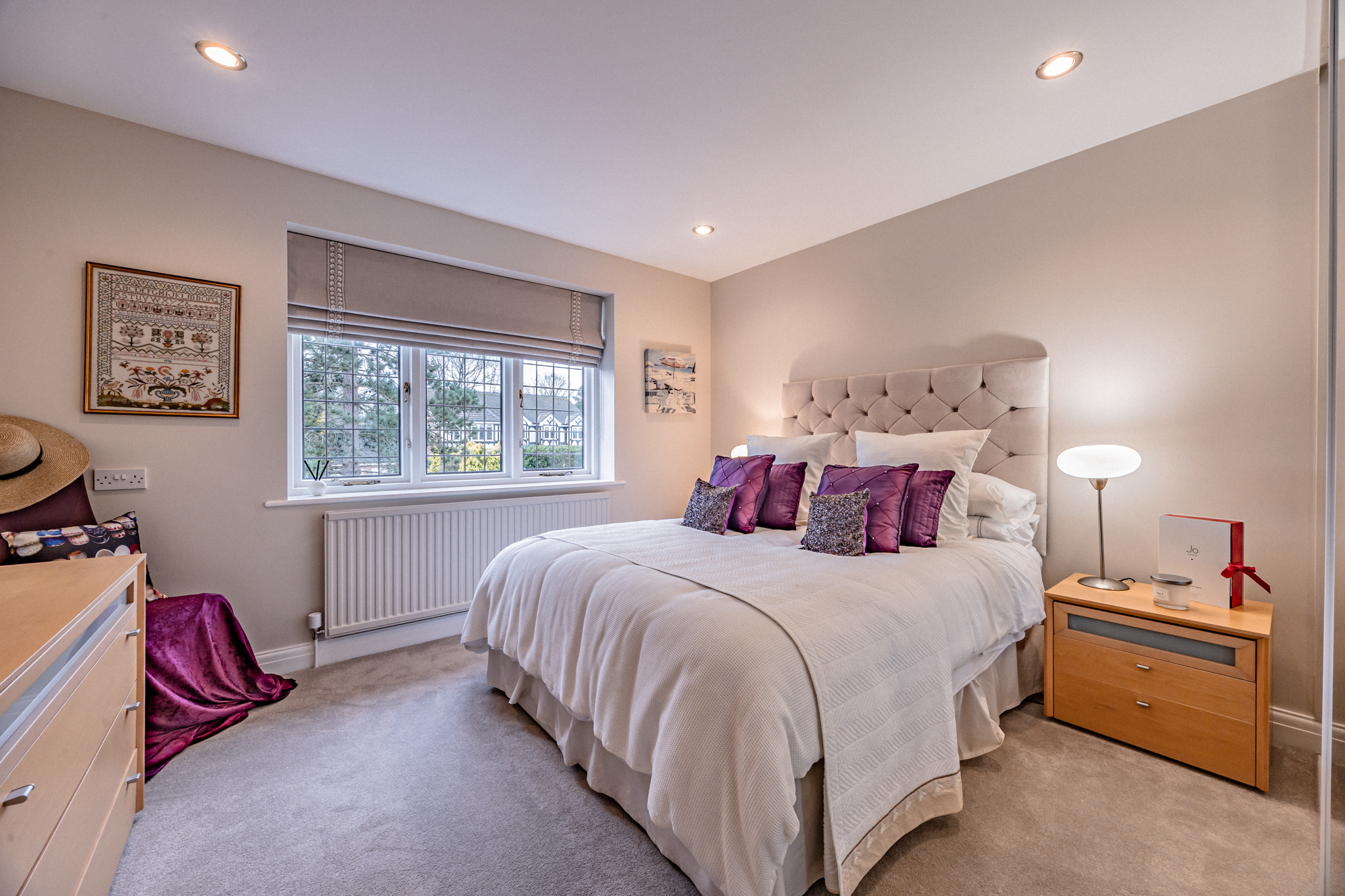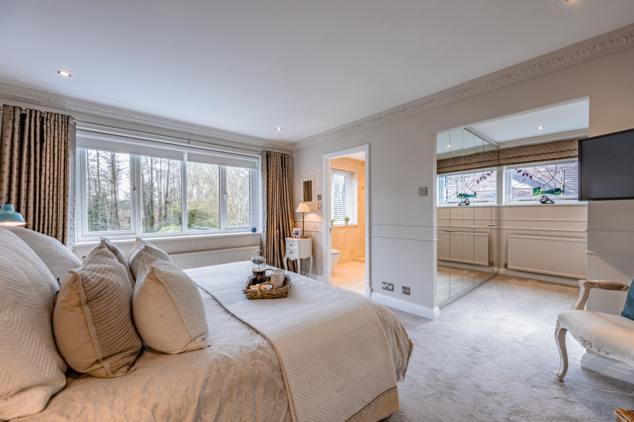 Upstairs, four generously sized double bedrooms continue the home’s sense of comfort and proportion. All front and side windows are wooden and double glazed. The principal bedroom easily accommodates a super king bed and features decorative coving, a large window overlooking the garden, and a dressing area illuminated by a stained glass side window. Built-in mirrored wardrobes provide excellent storage. The ensuite bathroom is fully tiled and includes electric underfloor heating and a walk-in wet room style shower.
