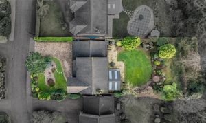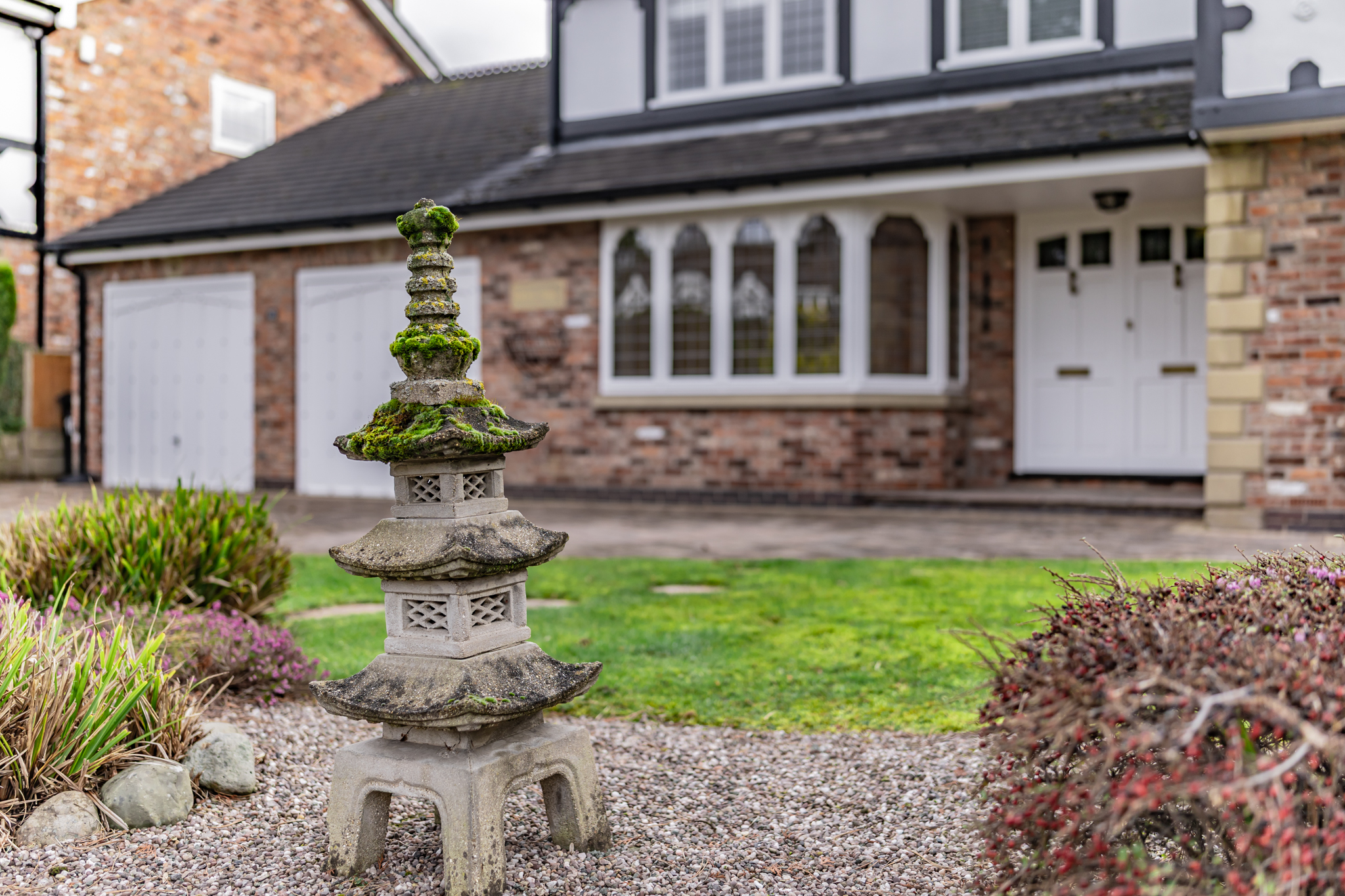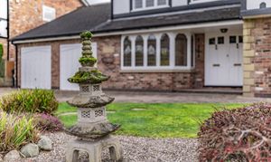Bellairs itself delivers exceptional Tudor-style curb appeal. The handsome black and white timber detailing, arched upper windows and warm brickwork create a façade of real presence and character. A curved block-paved driveway provides parking for approximately five vehicles and leads to the integral double garage with two electric up-and-over doors. The front garden has been thoughtfully landscaped with a Japanese-inspired zen aesthetic, featuring stepping stones, sculptural planting and a tall pine tree, enhancing the sense of tranquillity before you even step inside.