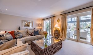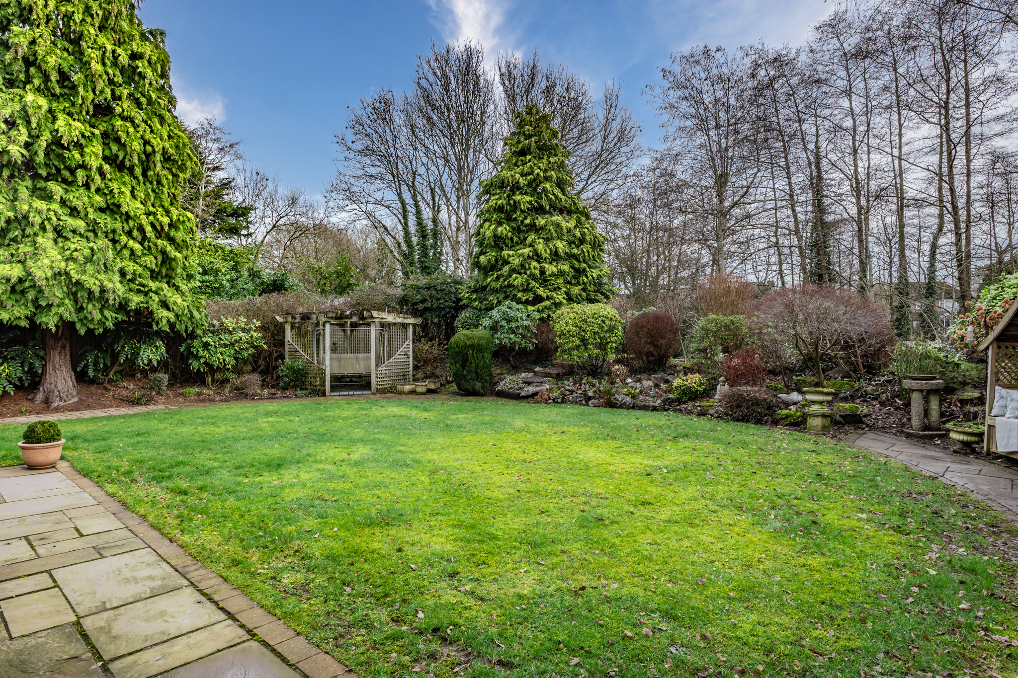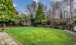 The garden unfolds across two levels, thoughtfully designed to capture sunlight throughout the day. Conifer trees line the borders for privacy, while a circular lawn forms a charming focal point. A pergola draped in cream wisteria frames the kitchen doorway, breath-taking when in bloom. The garden backs on to protected woodland offering a wonderful natural backdrop. Access runs down both sides of the house, with discreet bin storage by the garage, an outdoor tap and further exterior lighting.