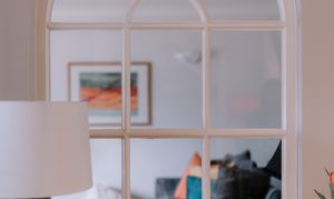 A tiled porch with inset doormat, decorative dado rail and grand wooden double doors sets the tone for the welcoming interior. Glazed inner doors open into a spacious hallway where double doors aligned with the entrance draw your eye straight through the house to the garden beyond a beautifully designed sightline that enhances the home’s sense of space and flow. A stained glass window graces the landing above, casting coloured light across the wooden banister staircase.