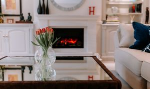 The living room is a refined yet inviting space, complete with ornate coving, a decorative dado rail and a gas fireplace with stone mantelpiece (installed approximately five years ago). Bespoke storage flanks the fireplace, including a concealed TV cupboard to keep the room elegantly uncluttered along with built-in cabinetry and a radiator cover topped with a display shelf. From here, two sets of double doors open seamlessly into the modern garden room.