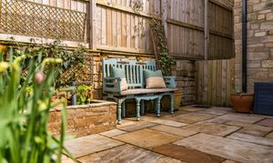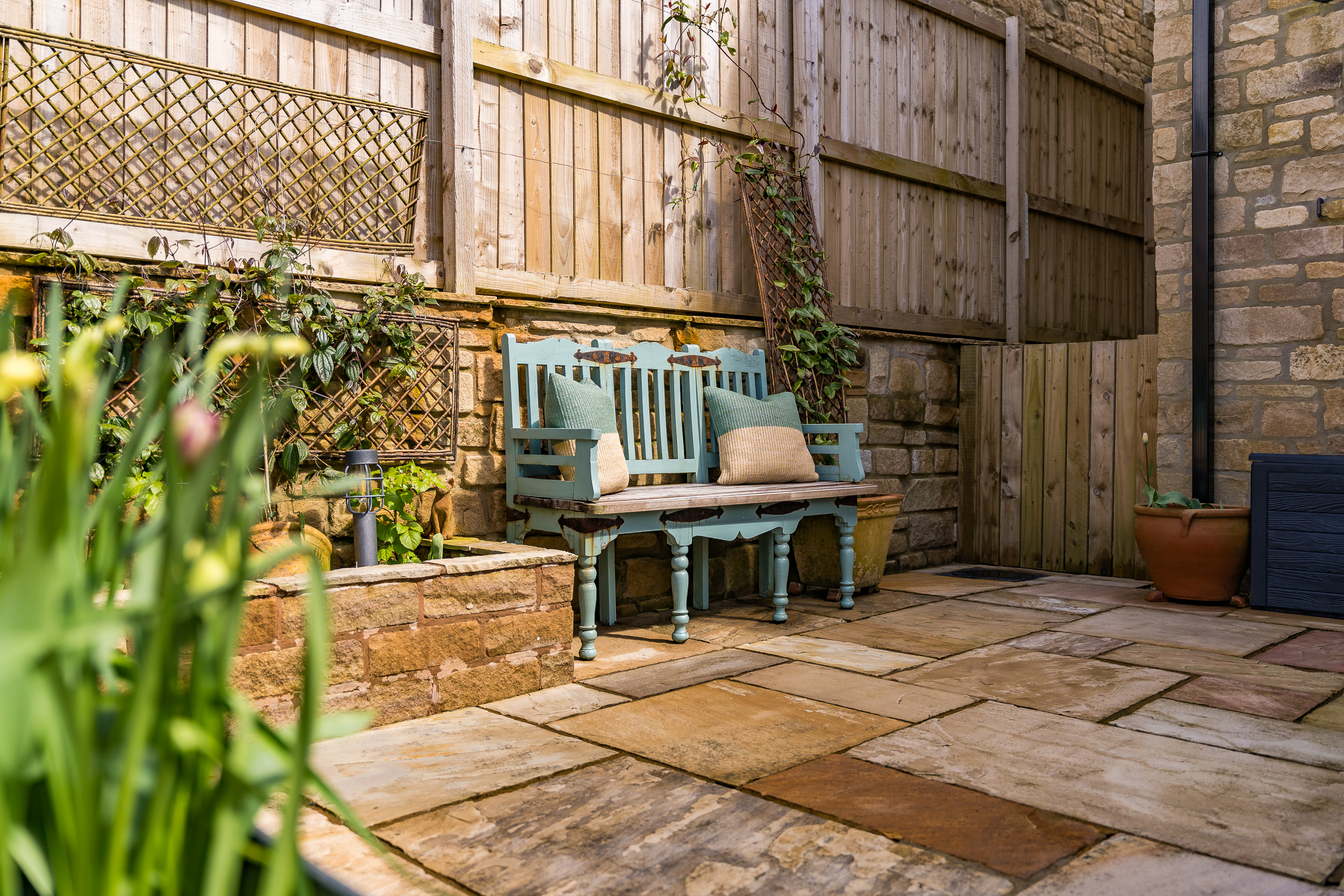Head through the gate to enter a fenced-off kitchen garden with sunken borders for pots, raised planters on the gravelled area, and an outdoor tap. Continue along the flagstone path and past the trellising and wooden gates into the rear garden, where recently planted trees create a buffer at the back.
