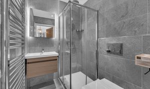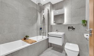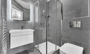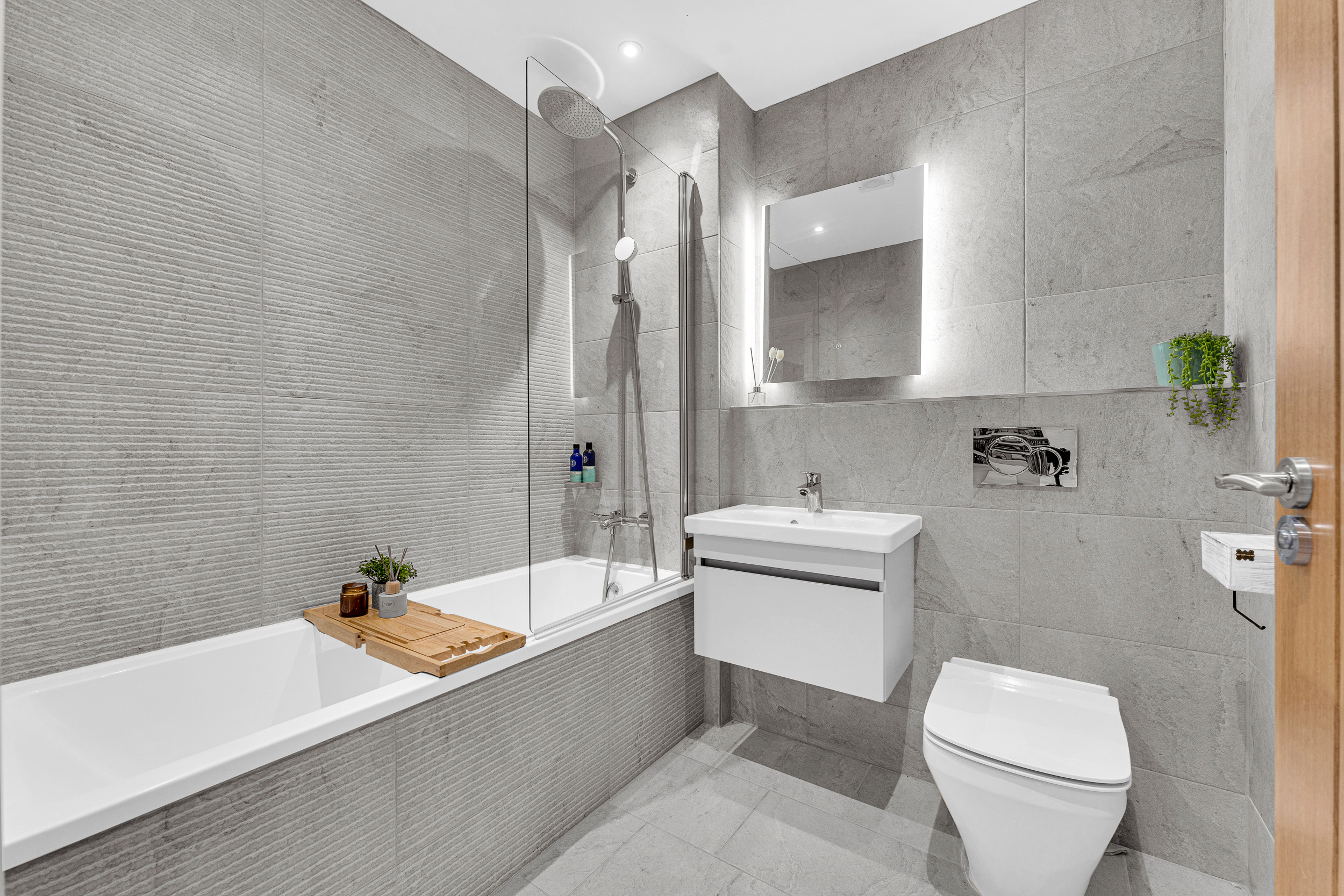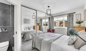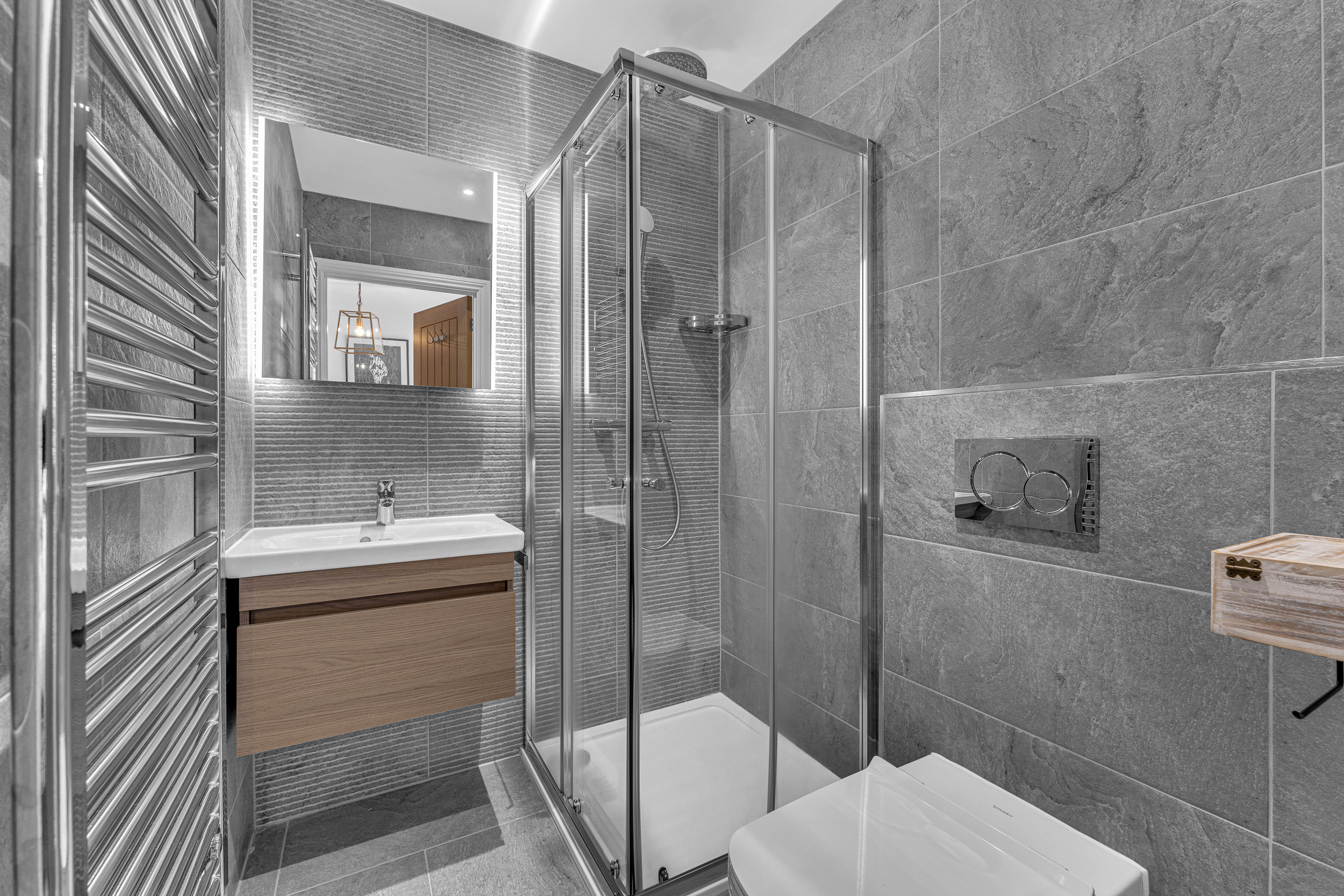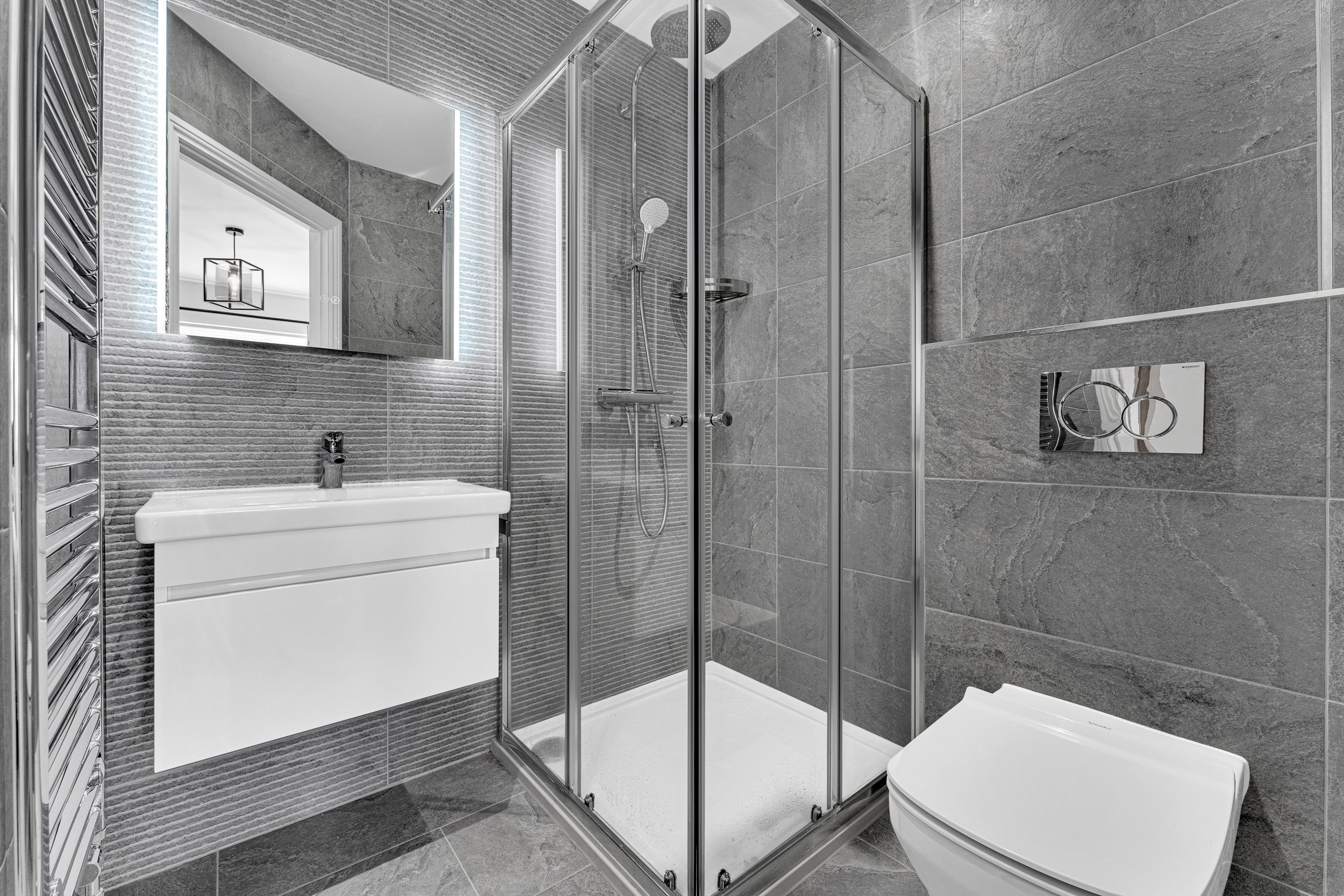 At the front of the house, bedrooms one and two feature en-suites, where grey stone-effect tiles with chrome trim offset modern high-spec sanitaryware, including rainfall shower enclosures, chrome heated towel rails, wall-mounted vanity basins with backlit mirrors equipped with Bluetooth speakers above, and back-to-wall toilets with chrome flush plates.