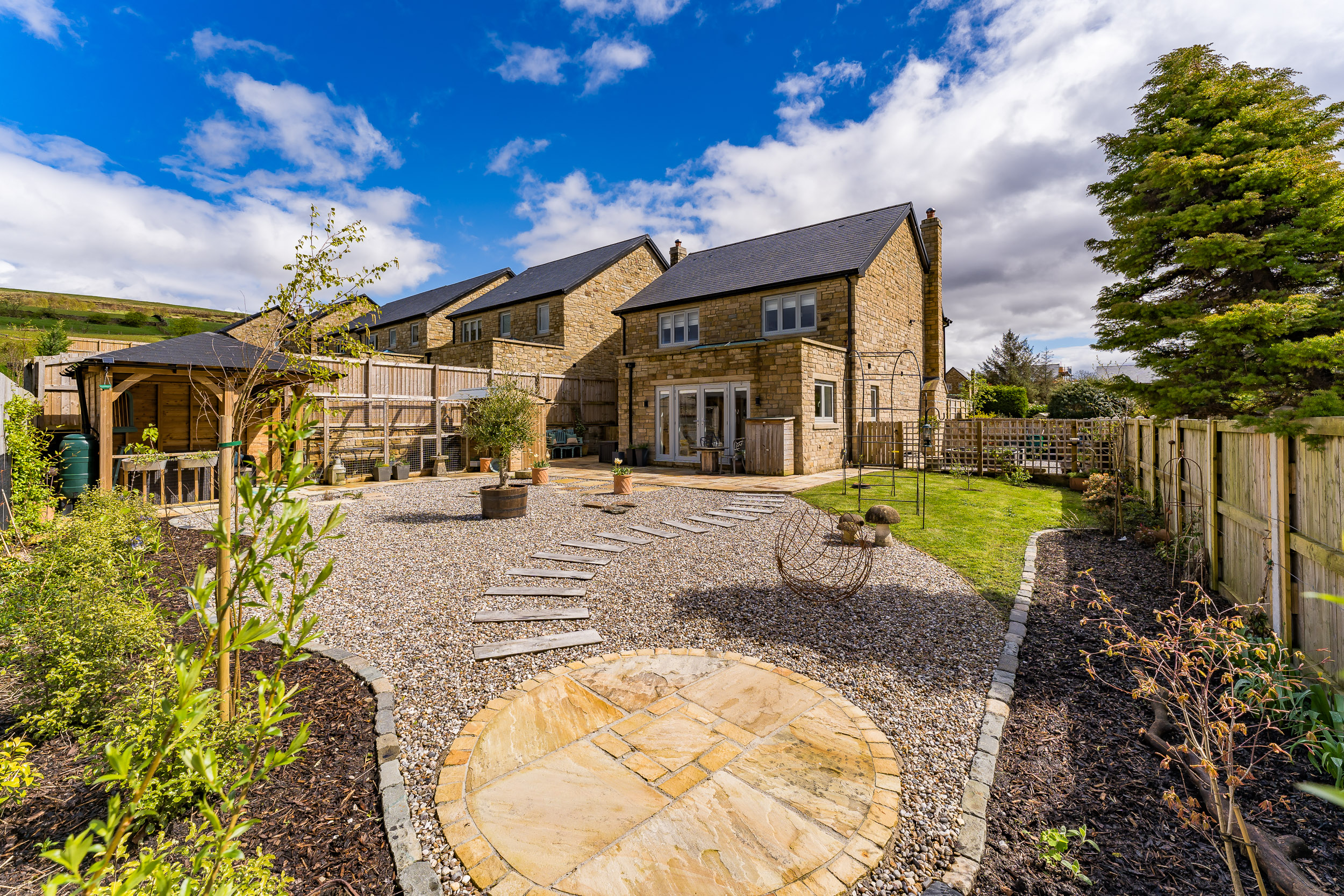 Due to its corner plot position, the house enjoys gardens to the front, side, and rear, maximising the lovely view across the local countryside. Beginning at the front, you’ll discover a lawn area fringed with shrubs and a natural buff stone flagstone patio.