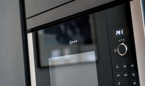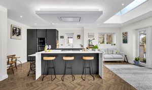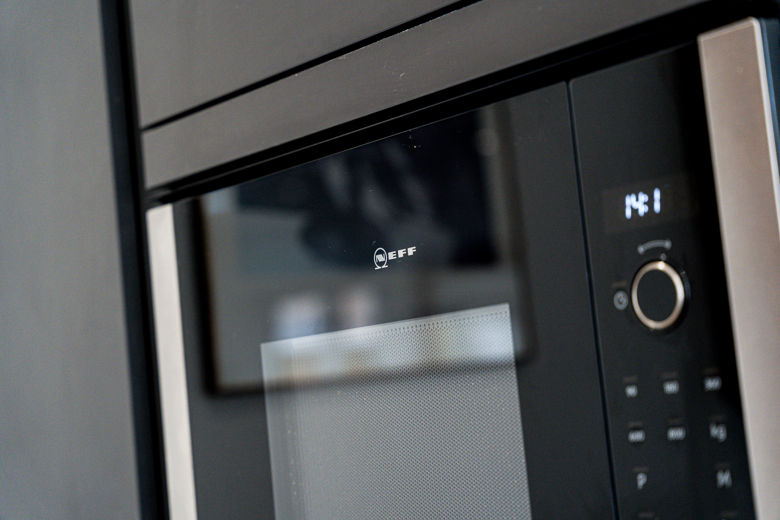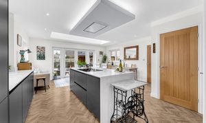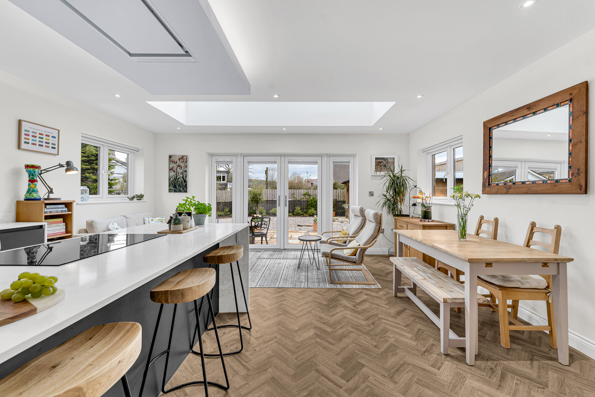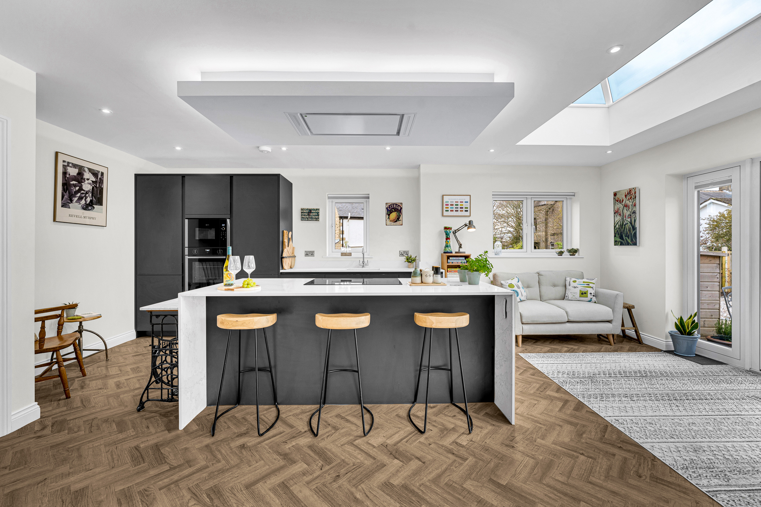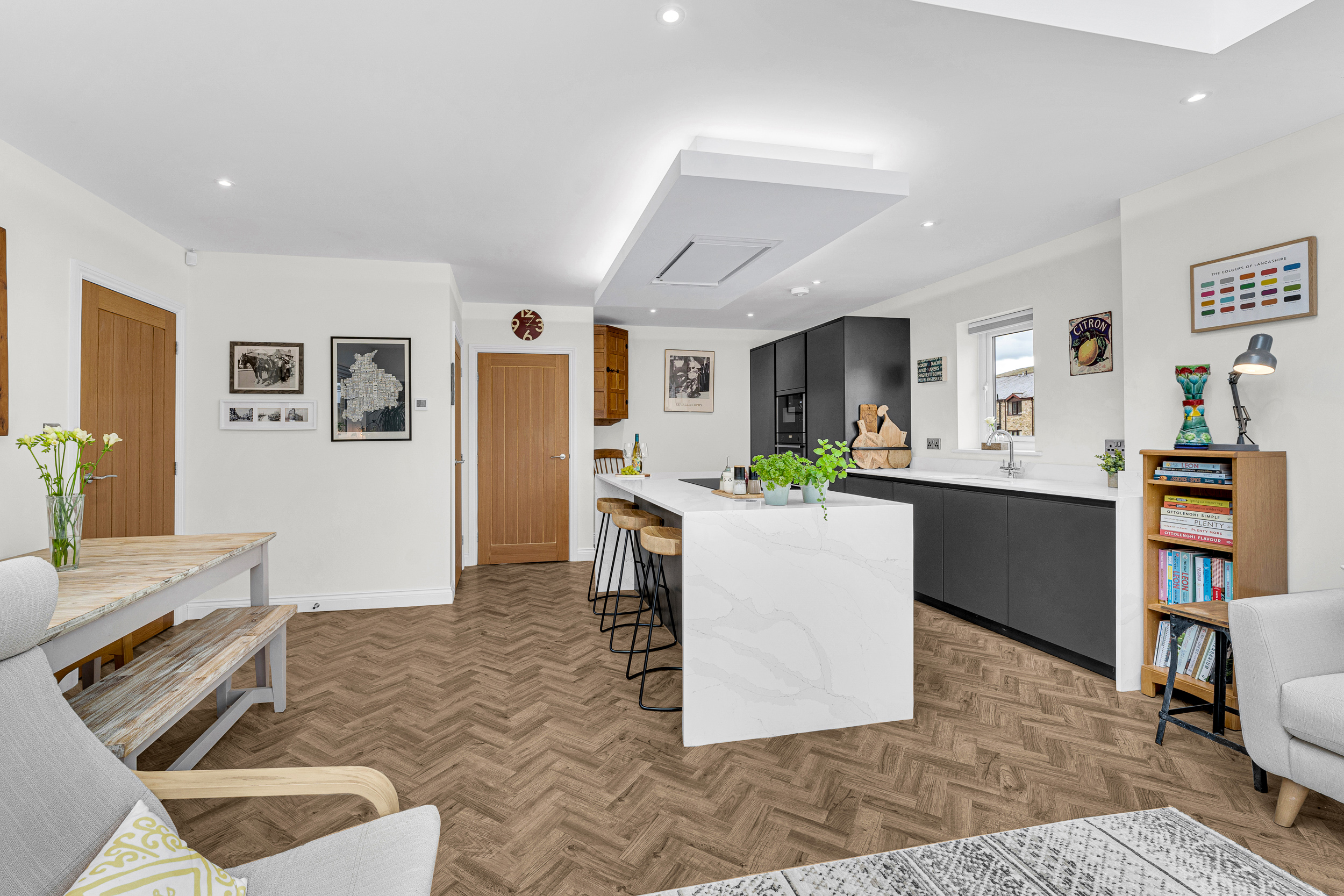 The practical layout was tailored for keen cooks, from the generous island unit with an induction hob and breakfast bar to the stylish ceiling extractor and a walk-in pantry providing extra storage for kitchen items and equipment. At the same time, sleek handle-less cabinetry contrasts with the white quartz worktops and upstands and incorporates a full range of integrated NEFF appliances.