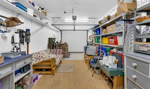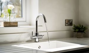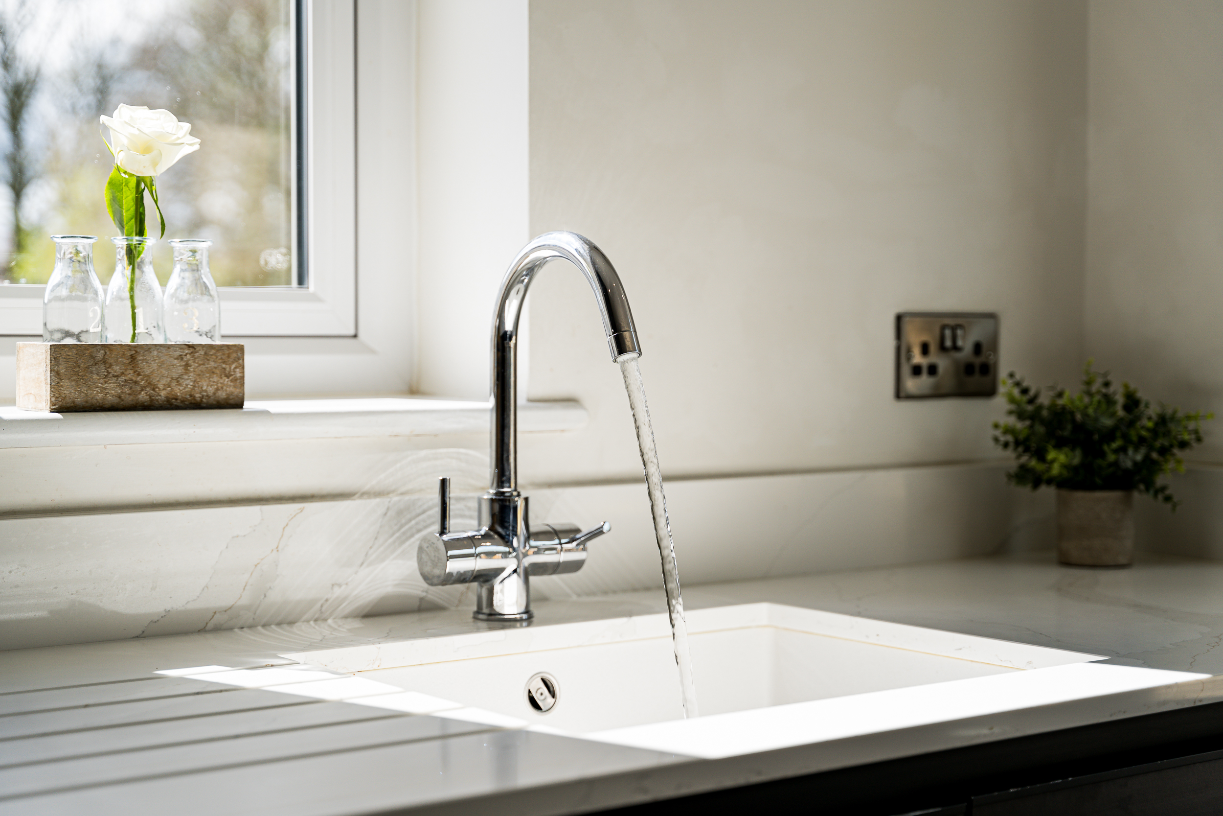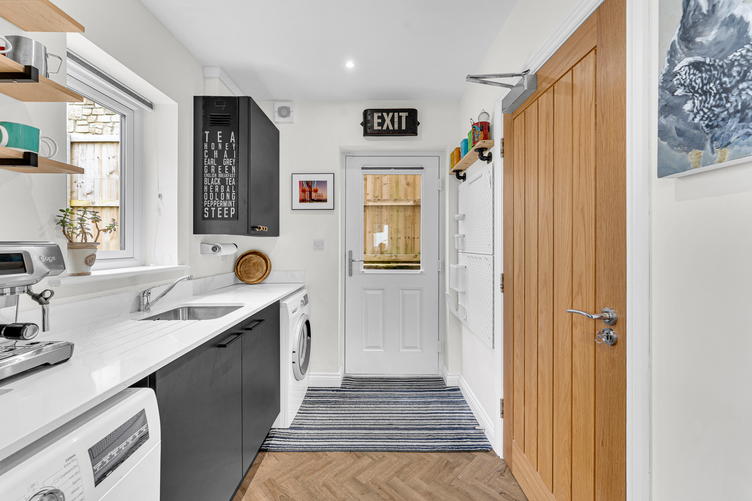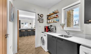 In the adjoining utility, matching cabinetry and quartz tops offer more storage and room for a freestanding NEFF washing machine and dryer. The current owners have installed shelving here to create a drinks-making station designed to improve circulation space and keep worksurfaces uncluttered. A Bibo chilled and hot filtered water machine plumbed into the sink below the window completes this facility. You’ll also find direct access to the garden and integral garage – useful when returning home from a muddy walk or with shopping bags.