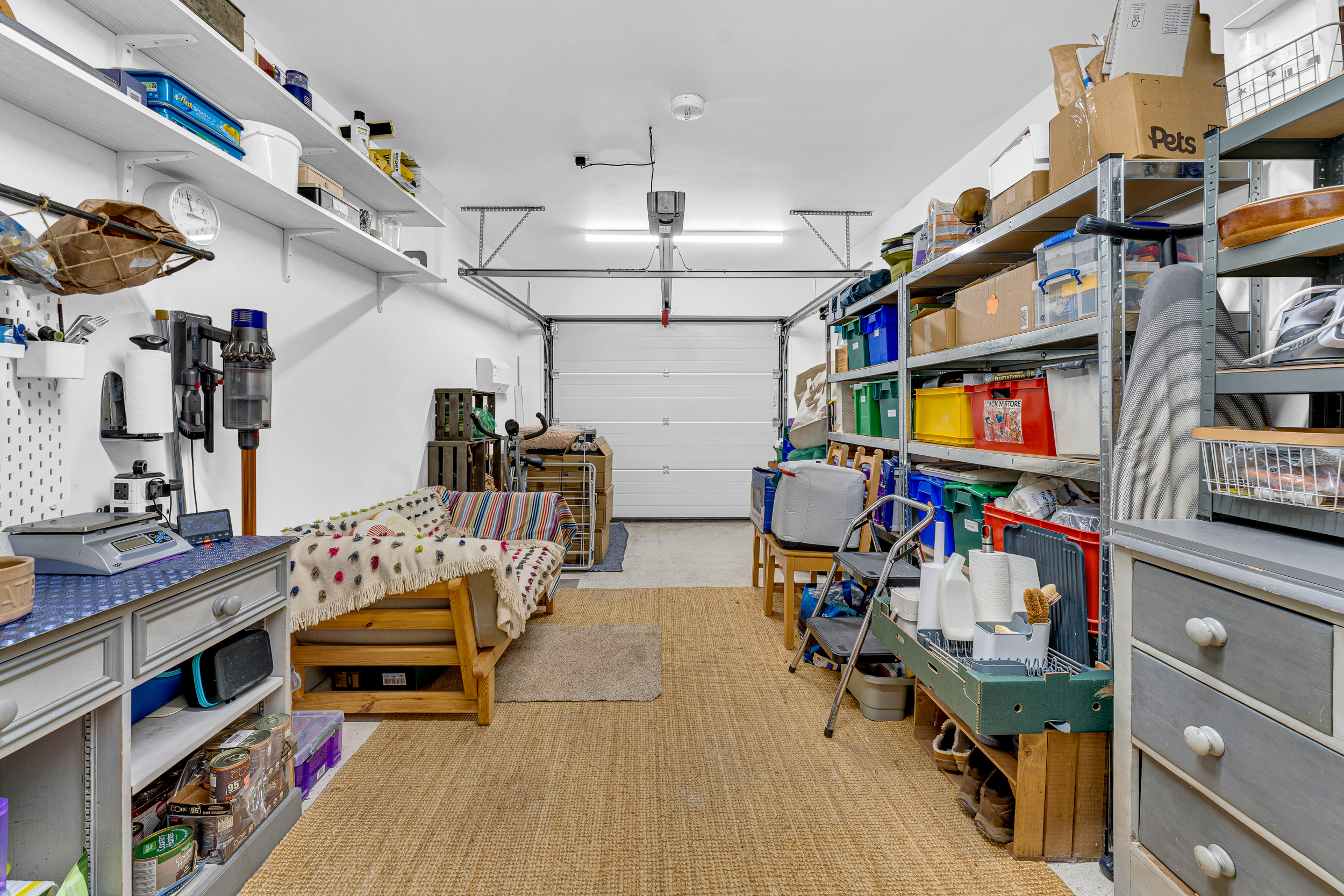 A matching stone wall and wrought-iron railings frame a pretty front garden and block-paved driveway, widened with a flagged path to the front door. The integral garage offers more parking and comes with extra racking and shelving and an electric car charging point outside.