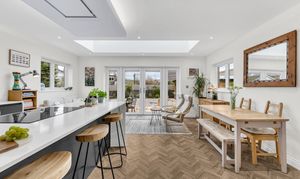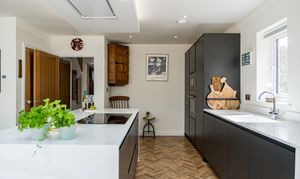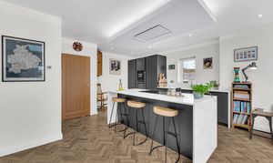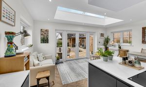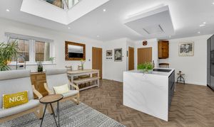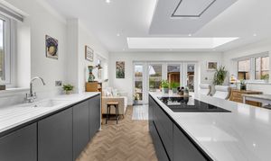 Continue now to the back of the house, where a massive roof lantern, triple-aspect windows and glazed French doors framing the serene rural views flood a SieMatic-fitted kitchen and living/dining area with natural light. Perfect Fit thermal blinds here and in the utility allow you to adjust the ambience, with rise-and-fall blinds to the French doors and windows added for more light, mood and shade control.
