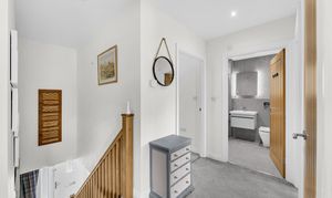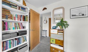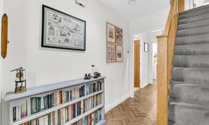 Upstairs, a soft grey carpet runs from a spacious spot-lit landing with a cupboard housing the hot water cylinder and in-built bookshelves into four large, neutrally decorated doubles. Three benefit from full-height wardrobes with sliding mirror doors, while two are fitted with bookshelves.