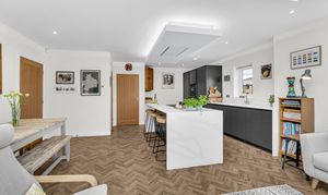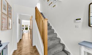 To the front, a stylish angled canopy featuring traditional oak beams shades a contemporary door fitted with a subscription-free Eufy Video doorbell. Inside a decorative industrial scaffolding pole is a feature in the hall and can hold a heavy curtain adding aesthetic appeal. Painted in soft whites, the spot-lit hallway features a gorgeous oak bannister to the carpeted staircase, which complements the wood-effect LVT herringbone flooring flowing into the kitchen.