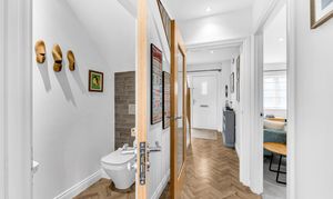 Head through the glazed hall door – fitted to create a more intimate entrance area and also enable access to the upper floor without disturbing anyone downstairs – to find a two-piece WC with a grey metro-tiled splashback.