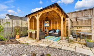 The main garden is landscaped and laid mainly with stone flags and gravel, edged with reclaimed Lancashire cobbles with a lawn to one side and wood-chipped flower borders. It is very low maintenance yet designed to appeal. As you bask in the sun under those wide-open skies and drink in the hill views from the gazebo in the corner, it’s easy to imagine you’ve been transported to the Mediterranean. You’ll also find a mini fruit orchard, a useful shed, and even a “catio” – a secure outdoor cat/pet enclosure with further seating.