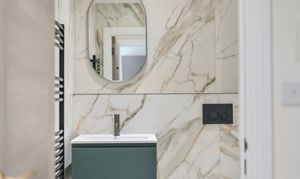 Herringbone-style flooring and floating vanity unit for a refined touch
