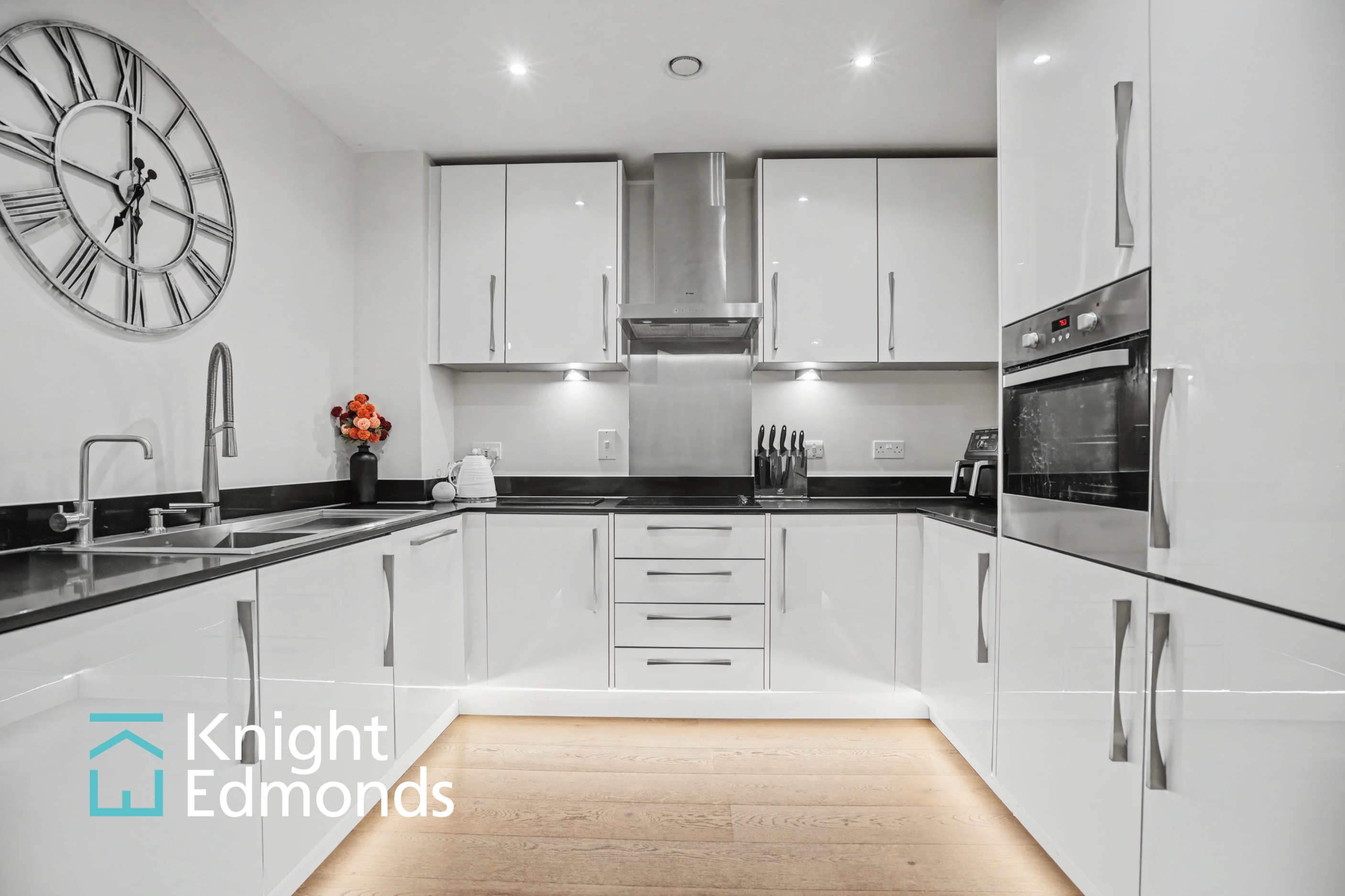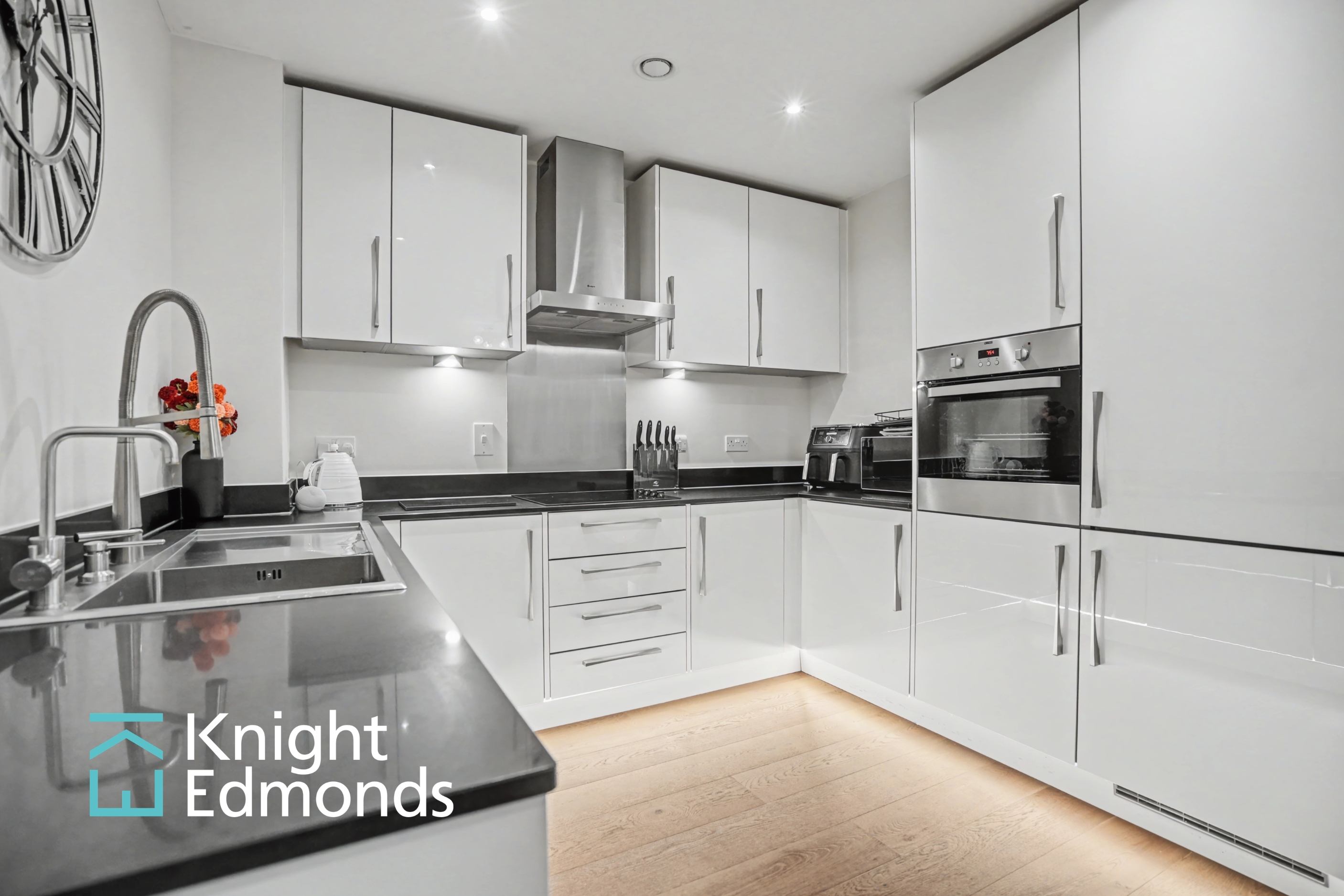 The modern fitted kitchen sits neatly off the living space, offering a range of contemporary wall and base units with integrated appliances and practical worktop space, creating a sociable and functional layout.