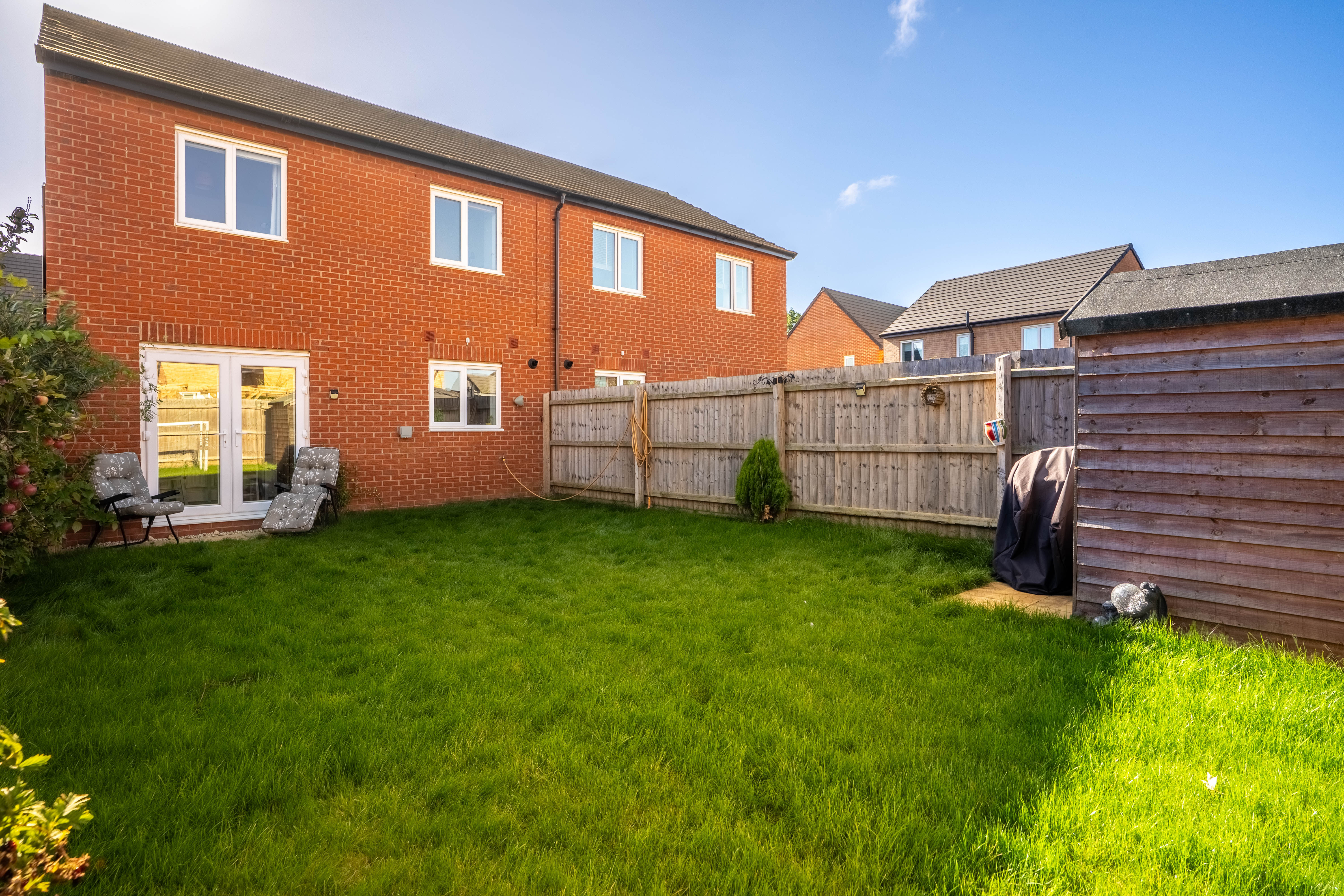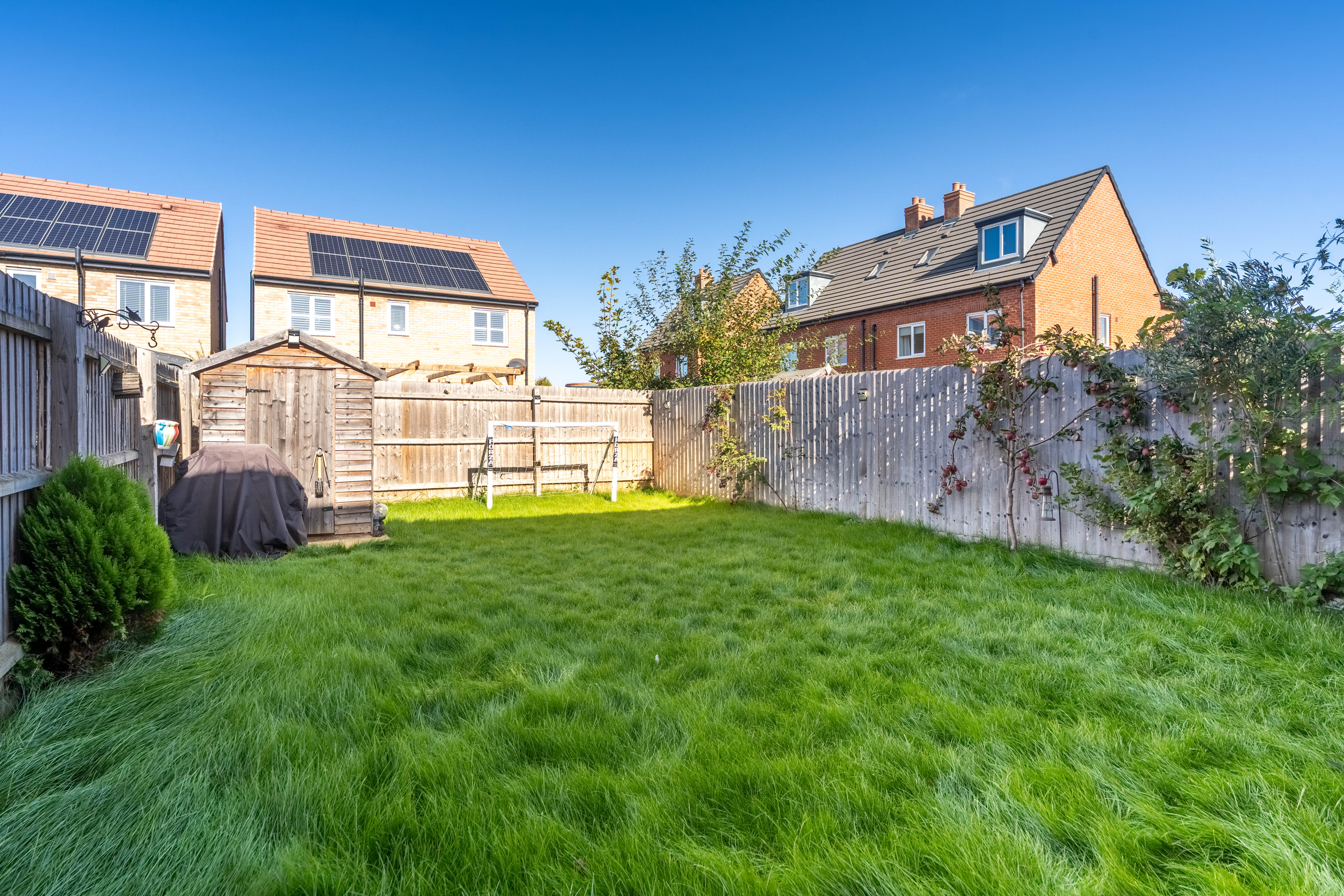 The rear garden is laid to lawn with a timber shed at the rear. To the front is a double-width driveway providing parking for two cars and an integral garage.
