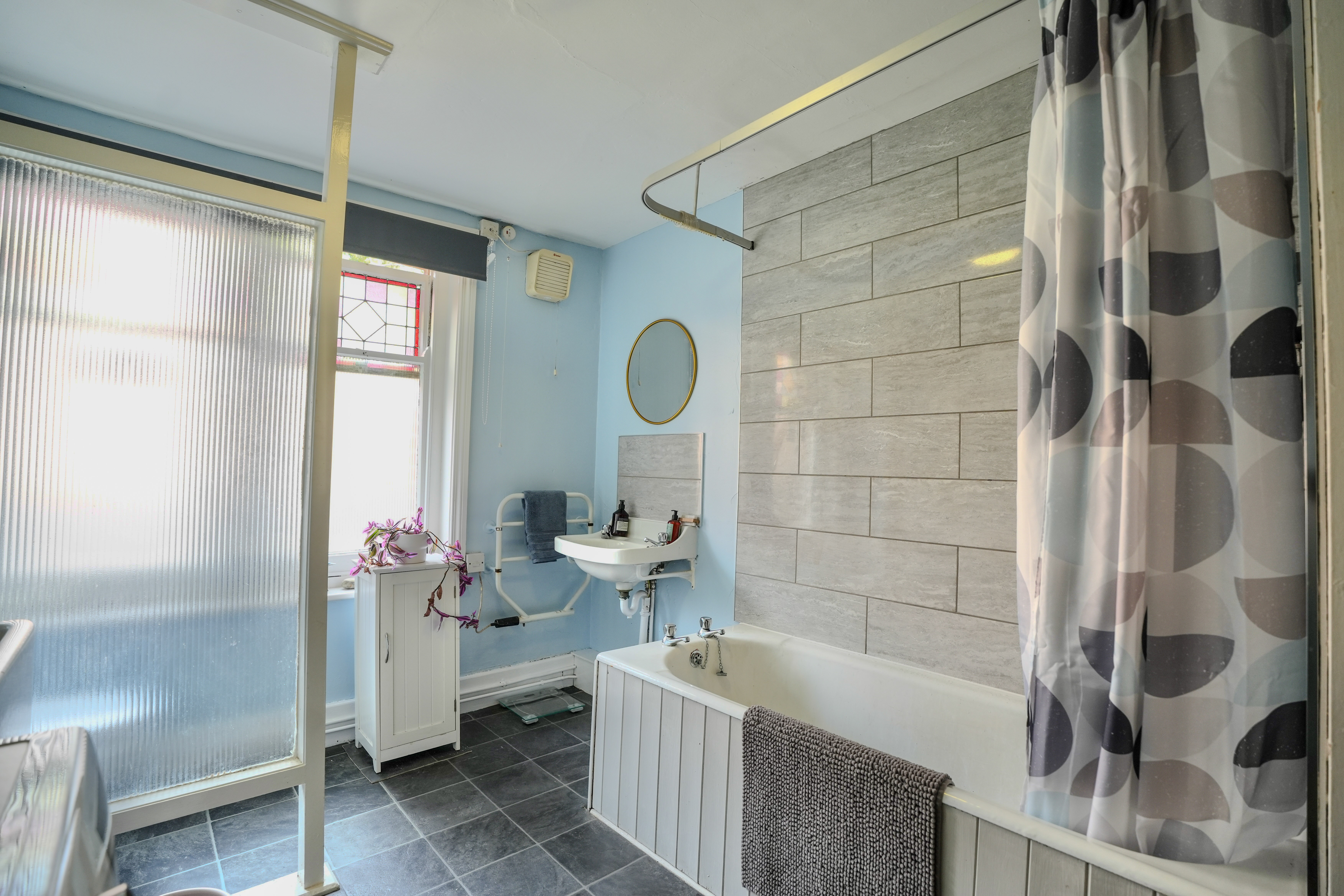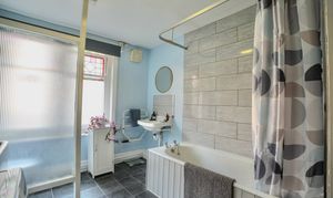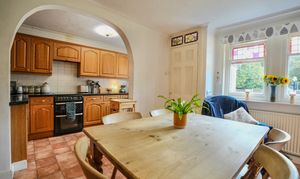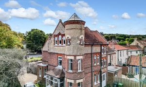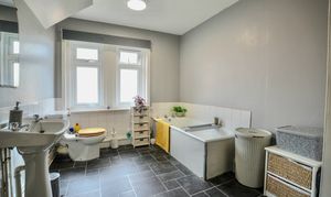 On the ground floor, the recessed side porch leads into the hall with stairs rising to the upper levels. The main sitting room is light and airy with a triple aspect and a charming corner bay window. A cosy snug or family room sits within the base of the turret, creating a unique and inviting space. To the front, a well-fitted kitchen flows into a generous dining area with plenty of natural light. Also on this floor are a large utility/family bathroom and a rear hall or porch area with useful pantry-style storage.