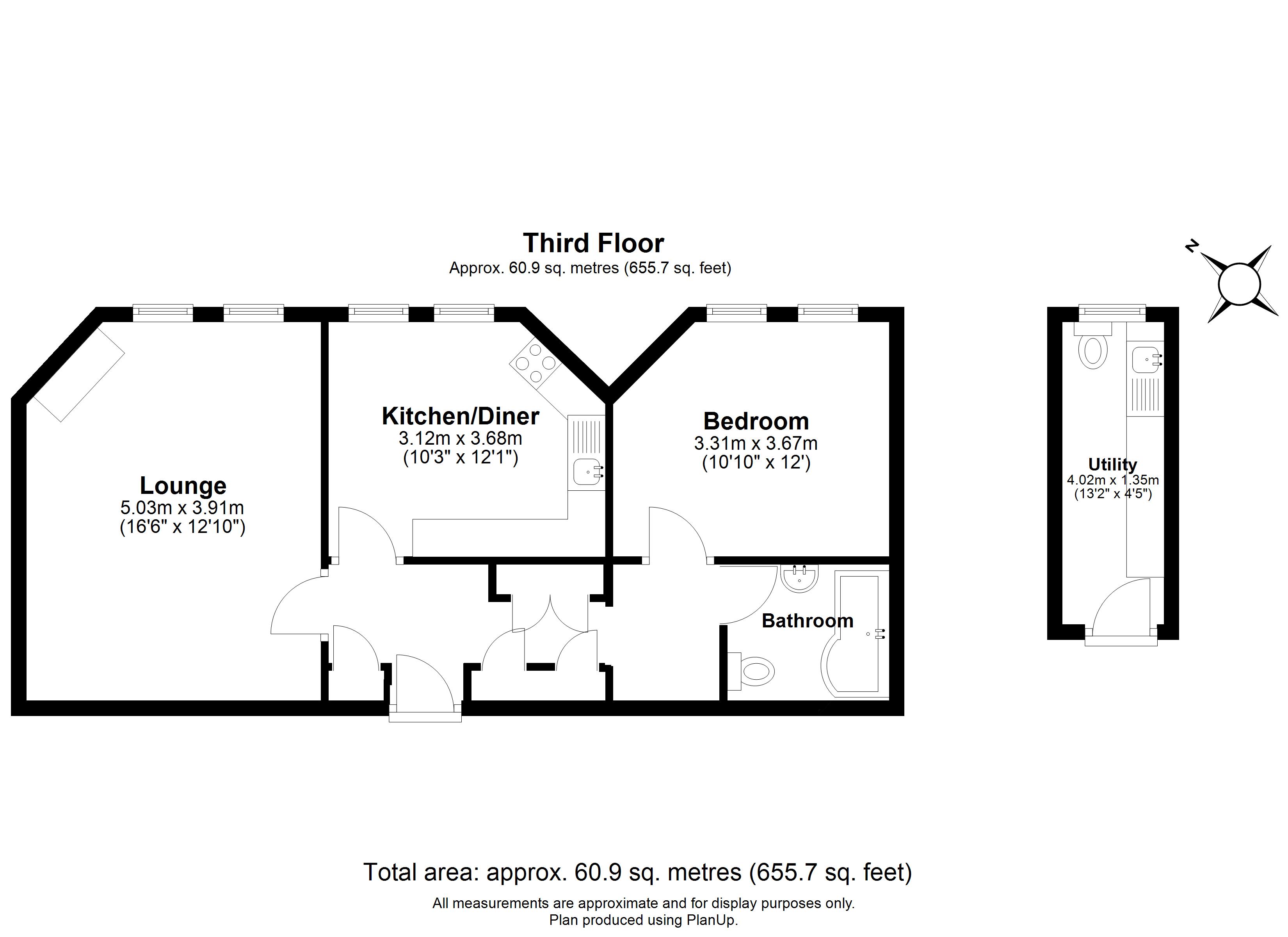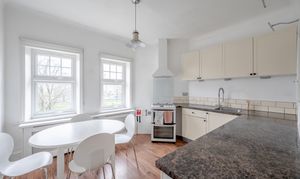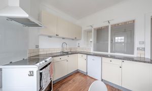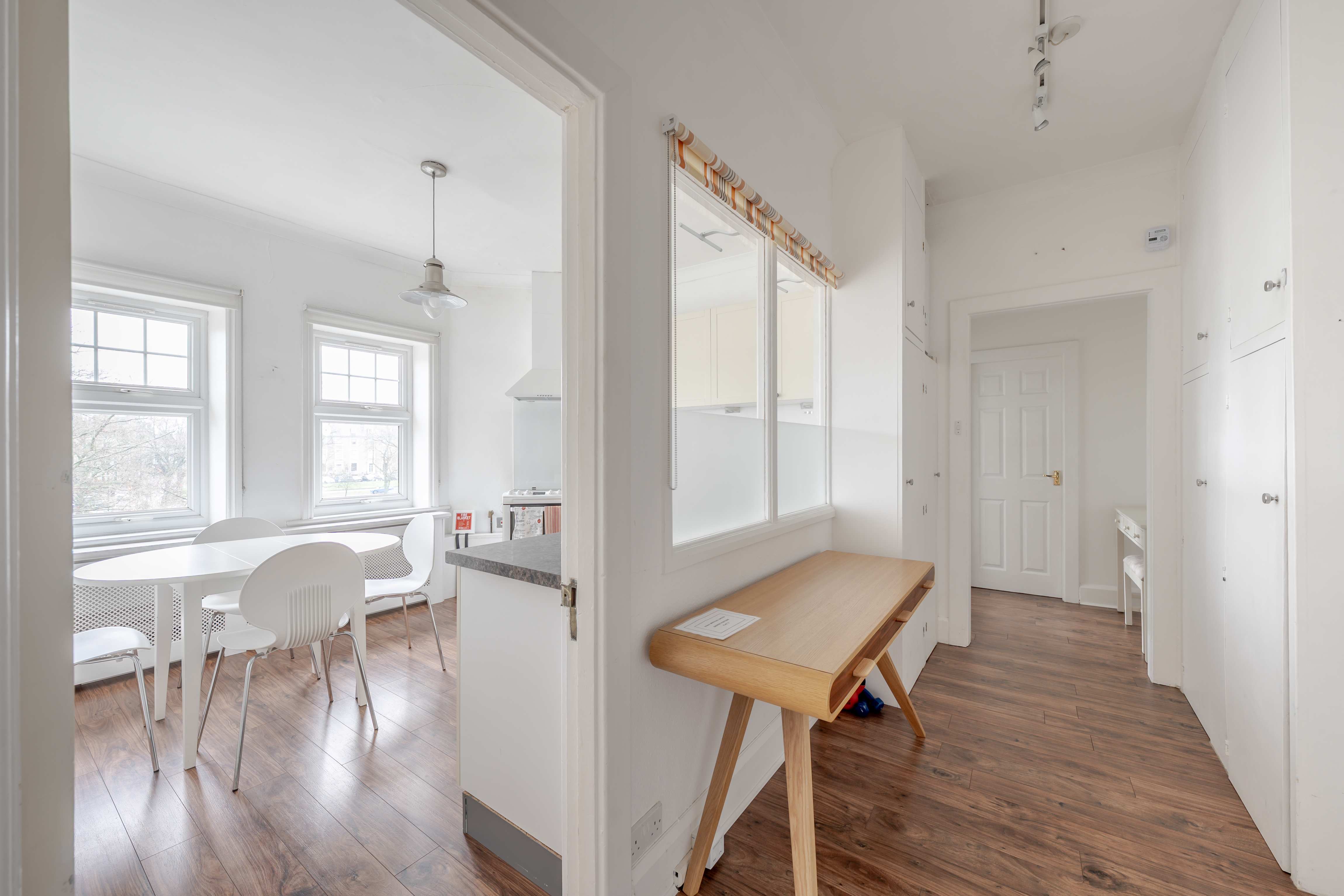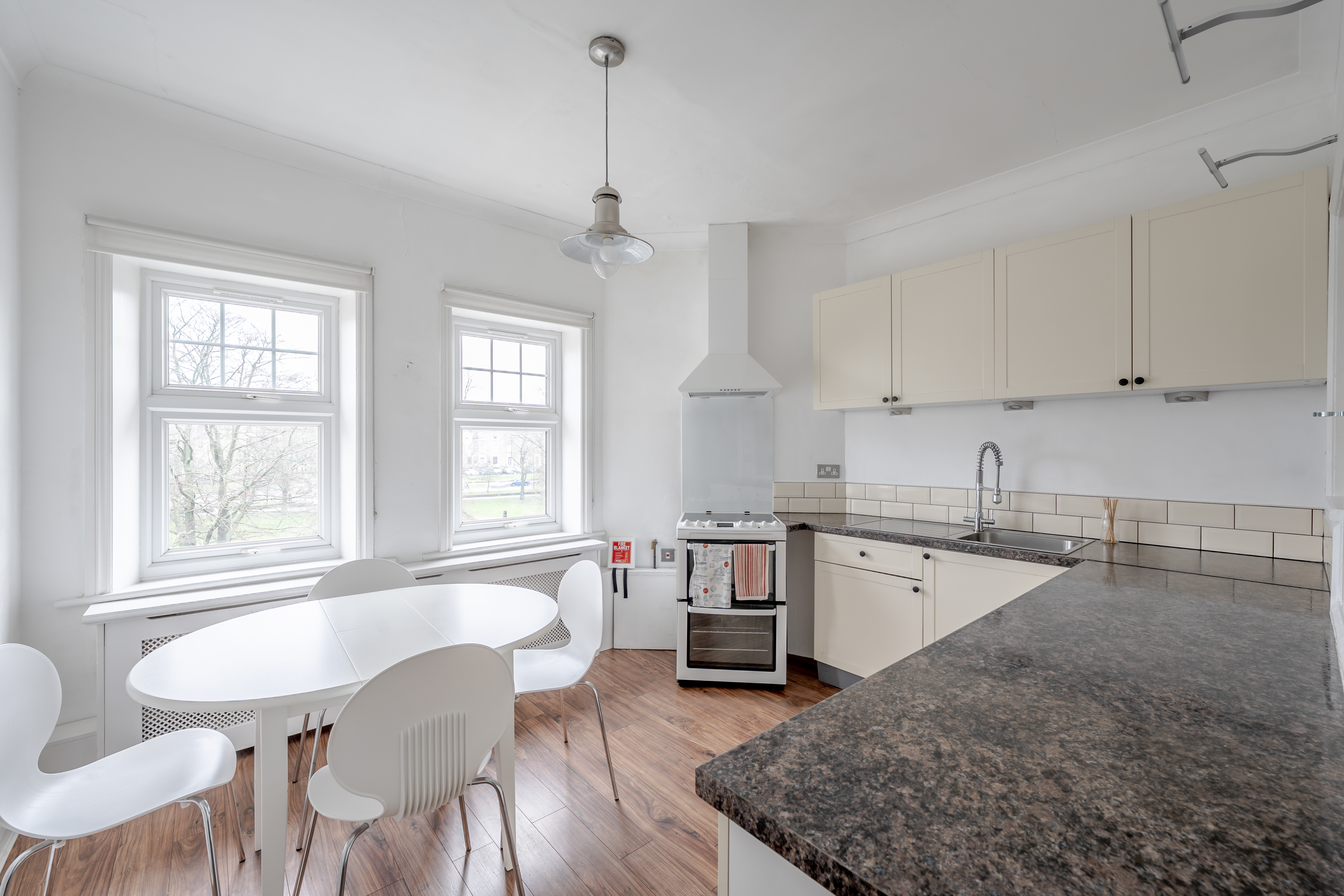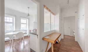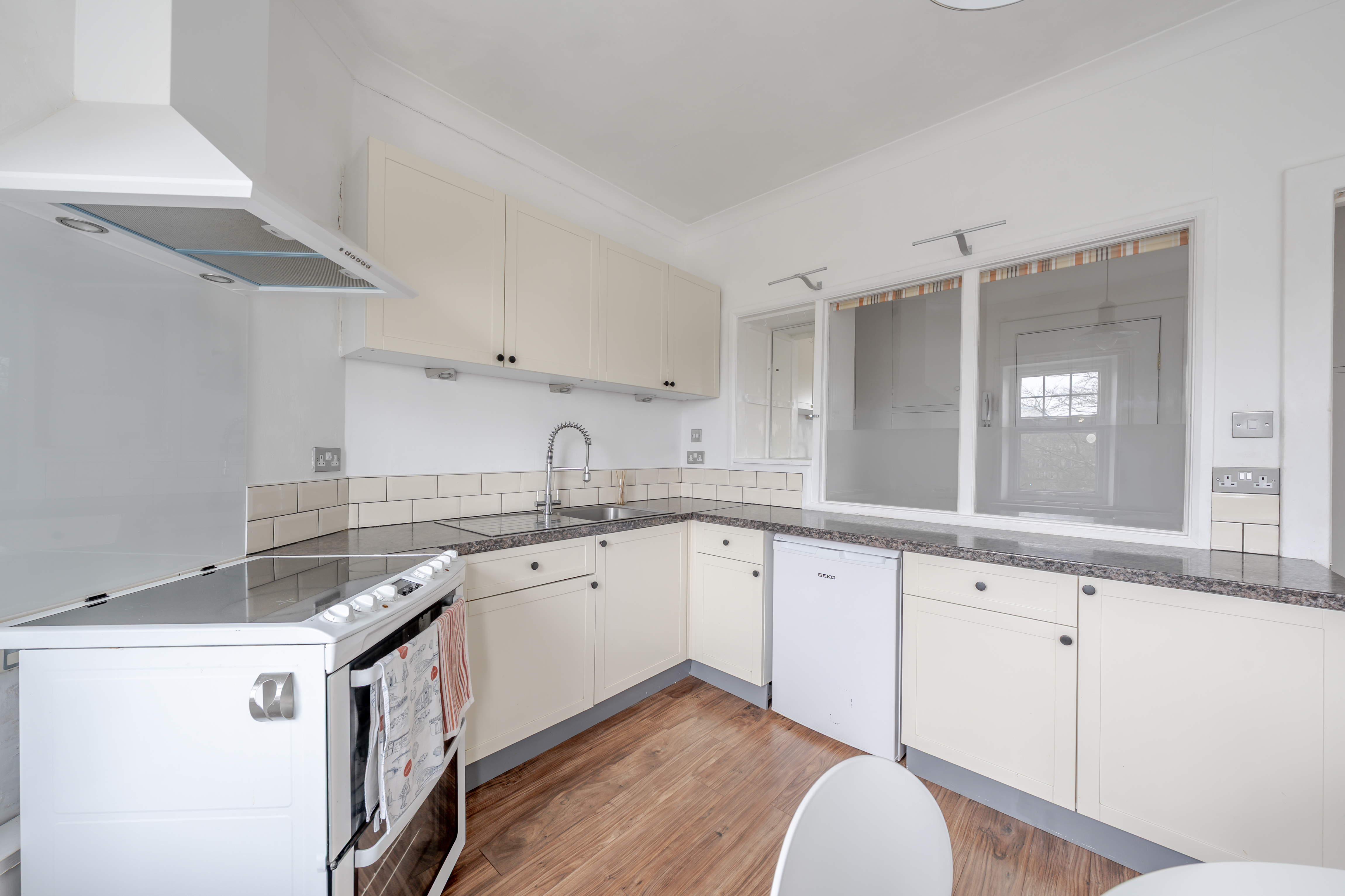 Accessed via a secure communal entrance with lift access, the apartment opens into a welcoming hallway with generous built-in storage, a separate WC, and a dedicated laundry room equipped with a washer and dryer. All white goods, including the oven, fridge, washer and dryer, are included in the sale. The property benefits from gas central heating throughout and leads into a spacious kitchen/diner featuring ample cabinetry, integrated appliances, space for a dining table and chairs, and delightful leafy views.